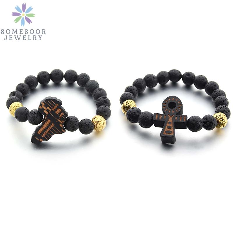 SOMESOOR Egyptian Ankh Bracelet Wood African Map Engraved Wristband Lava Stone Beads Ethinic Charms Bangle For Women Men Gifts