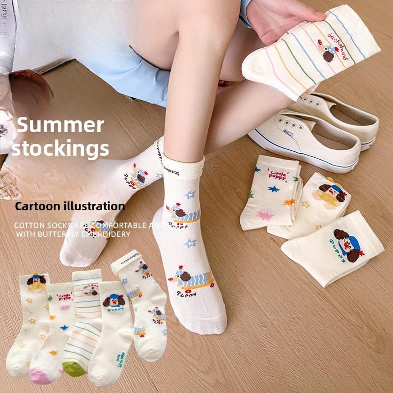 Women's Mid-calf Socks, Pure Cotton Spring and Autumn Thin Pile Socks, Trendy Socks, Cotton Socks, Summer Cartoon Striped Dachshund