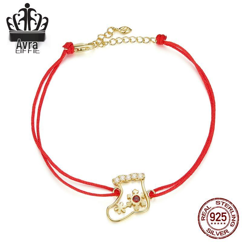 Everle Christmas Stocking Bracelet: Hand Rope Sterling Silver S925 with Gold Plated Zircon, Red Hollow Stocking Design