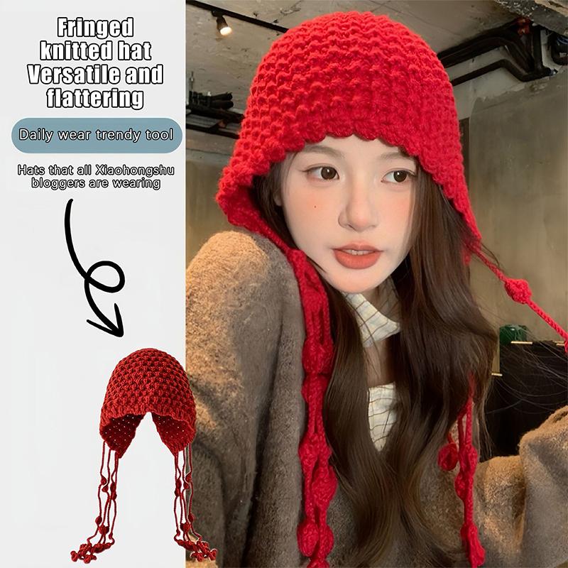 Sweet Handmade Autumn Winter Knitted Beanies Hat Wool Warm Ear Protection Hat Windproof Tassel Pullover Hat