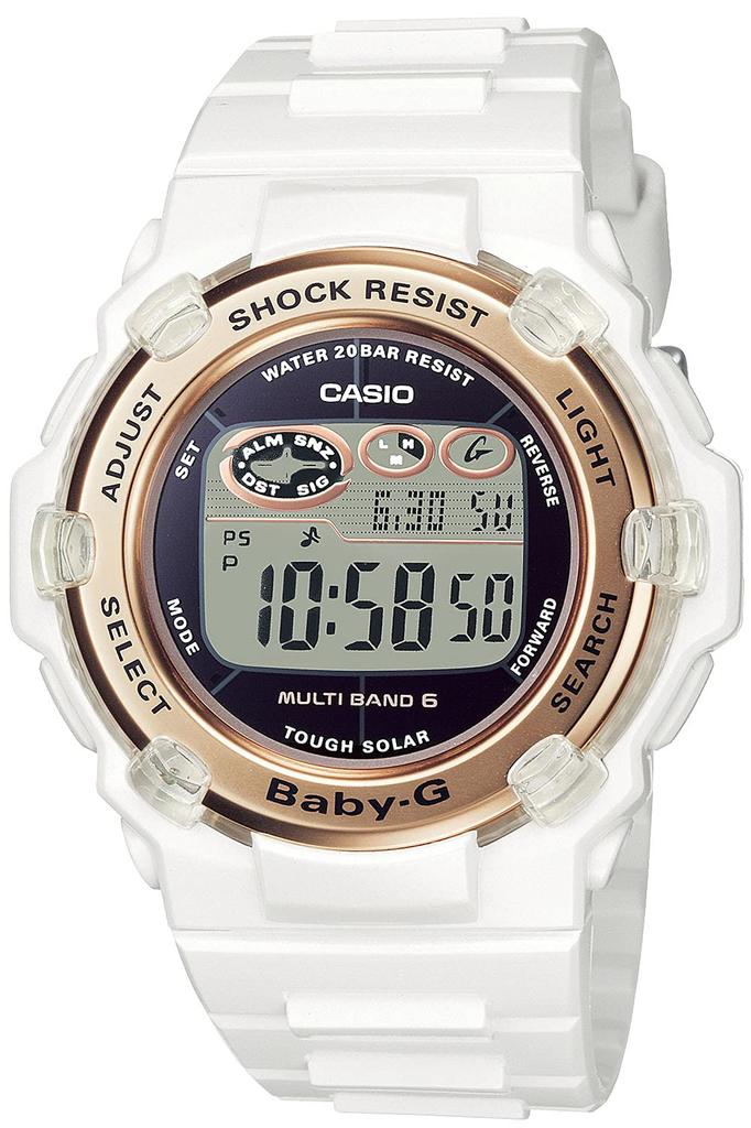 BABY-G is a casual watch for active women. This thin, round-face digital model is available in black and gold, white and gold, black and pink, and pastel pink. The wide variety of colors adds a touch of elegance to any outfit. Simply change the home city setting to automatically correct the time both in Japan and overseas. Functionally, it supports radio timekeeping from six stations worldwide and is equipped with Tough Solar technology. It's also water resistant to 20 ATM for practicality. It also features a full range of functions, including world time and a stopwatch. This is a model perfect for active women.