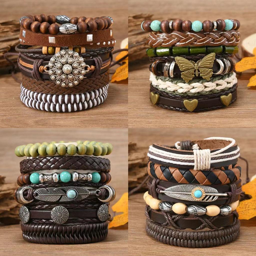Leather Bracelets for Men Women Handmade Wrap Woven Cuff Bracelets Wooden Beaded Bracelets Vintage Ethnic Tribal Wristbands Bracelet Set Adjustable
