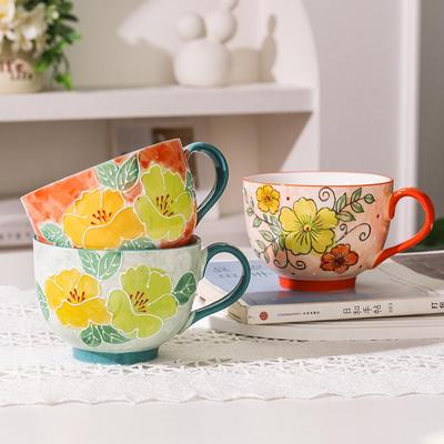 Rustic Hand-Painted Floral Ceramic Breakfast Mug, 500ml Large Capacity Coffee Mug, Colorful Floral Pattern Household Milk Mug