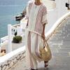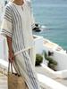 This stylish women's outfit features a short sleeve top and wide leg pants set in a classic black and white striped design. The loose fit provides comfort and breathability, perfect for summer vacations or casual outings. The set is made from a soft linen blend fabric that drapes elegantly while keeping you cool in warm weather. The minimalist black and white stripes add a timeless touch to this versatile ensemble. Pair it with sandals for a relaxed yet chic look ideal for beach getaways or city strolls.