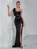 This elegant evening dress features a sophisticated off-shoulder design and a chic slit, perfect for formal occasions. Made from luxurious satin, it offers a sleek and smooth appearance that enhances its timeless style. The solid color adds a touch of classic elegance, making it a versatile choice for any special event. Comfortable and stylish, this dress combines a modern silhouette with a touch of glamour.