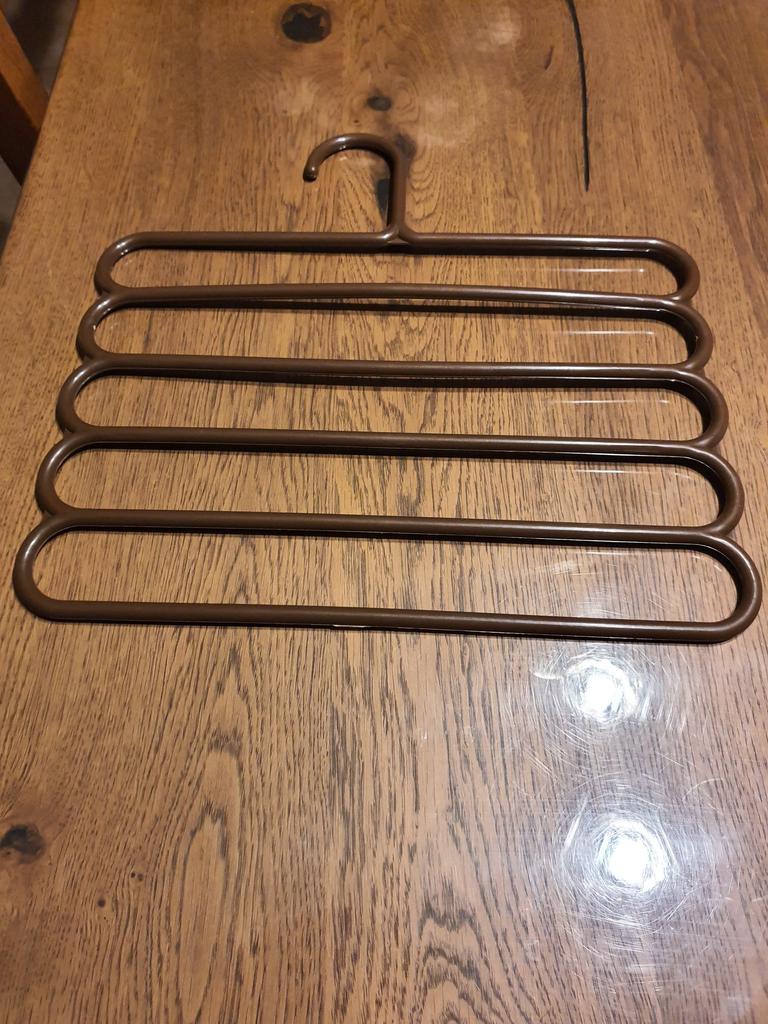 Buksehenger, mottatt i tide. Laget av hard plast, praktisk for et omkledningsrom. Plass til 5 bukser.