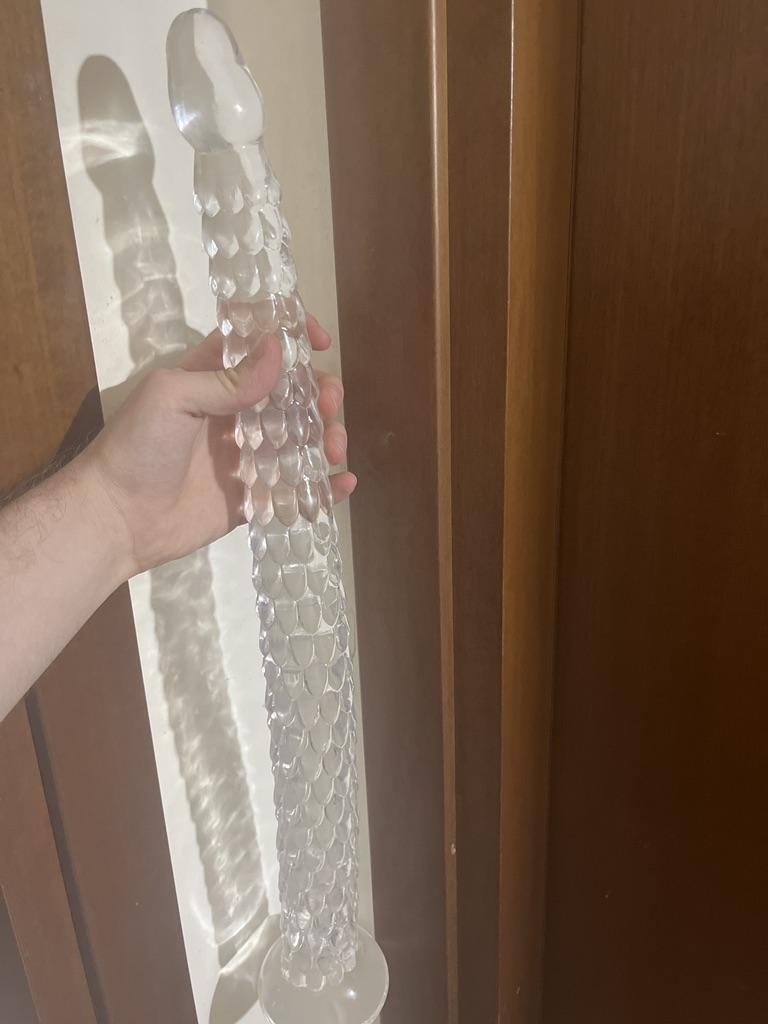 -Produktet kom som angitt i beskrivelsen, så ingen vanskelige øyeblikk når du henter det fra posten. Den har en liten duft, men den er ikke forferdelig. Bonuspoeng fordi produktet kom i tide. -Jeg er glad jeg kjøpte den største størrelsen. Det føles fantastisk innvendig! Det gjorde litt vondt i starten (mest sannsynlig fordi det er mitt første sexleketøy av denne størrelsen), men nå er det helt greit. Skjellene på den gir den en fin tekstur, så den føles ikke ren. -På det tredje bildet kan du legge merke til full lengde. Den andre dildoen er rundt 20 cm lang og 4 cm bred. -En ting jeg bør nevne er at du TRENGER glidemiddel til det. Jeg var i stand til å sette inn bare 3/4 av størrelsen uten glidemiddel, så jeg vil legge igjen en oppdatering når smøremiddelet mitt kommer og hvis denne situasjonen endrer seg. Totalt sett likte jeg denne nye dildoen veldig godt.