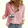 Women Fashion Buttoned Long Sleeve Shirt Ladies Casual Thin Cotton Linen Top Cat Print Long Sleeved Blouse