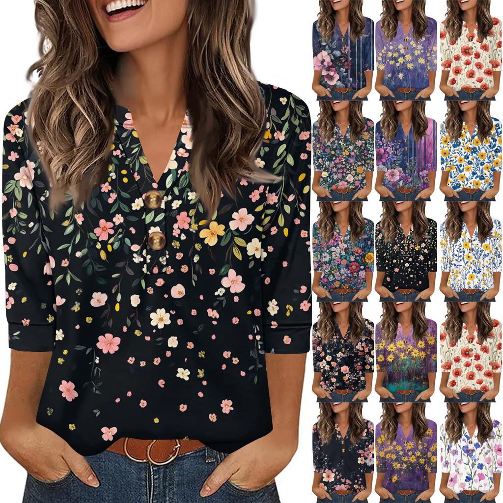 Ladies' fashionable and casual floral printed three-quarter sleeve loose V-neck button shirt Features: 1.Material: Made of high quality material, suitable for everyday wear, made of soft fabric, polyester, light and comfortable, easy to dress up or take off, comfortable to wear all day long. 2. Occasion: This product is perfect for everyday, beach, outing, party, work, casual wear. It's so random you might some extra covers! This one is available in a variety of solid colors to suit your personal. 3. It can be given to friends, family, yourself, etc., it is the best choice for gifts 4. Wash with cold water, the size will not change much, if you have any questions when choosing, welcome to consult 5. Different monitors will have a little color difference, please don't mind Product information: Seasons: Four Seasons Material: Polyester Gender: Female Occasion: Everyday, Casual Sleeve Length: 3/4 Sleeve Fit: fit Thickness: Standard Washing method: Hand wash in cold water, hang or dry You will get: 1 x Women's top