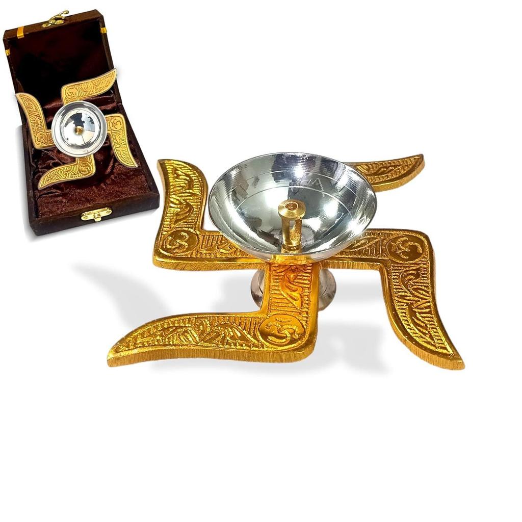 Set of 1 Medium 4-inch Brass Swastik Diya for Puja, Housewarming and Return Gift. (Silver & Golden Pital Akhand Deep Vilakku- with Box).
