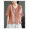 Bomull Lin Damebluser Skjorter i kinesisk stil Løse Sommer O-hals Vintage Klær Ensfargede Kortermet Dametopper