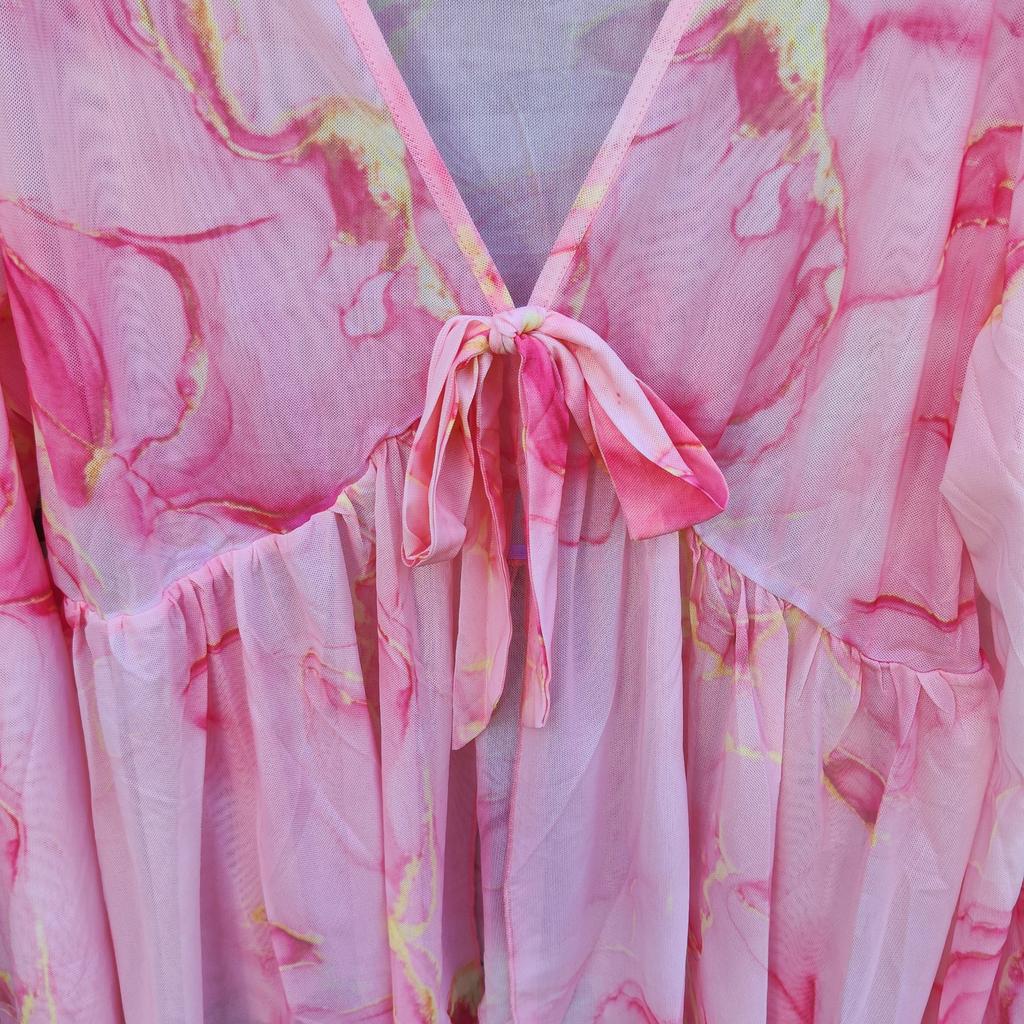 Denne dametoppen er et flott valg for en avslappet stil med et snev av sommerlig eleganse. Den løse og draperte passformen smigrer kroppen og gir en følelse av komfort, spesielt på varme sommerdager eller på ferie.. Et delikat trykk med rynkede ermer tilfører visuell interesse og flyt, og V-halsen fremhever halslinjen og gir et feminint og elegant utseende. Stoffet er blandet (bomull og polyester) og tilbyr en balanse mellom mykhet og pusteevne og slitestyrke og vedlikeholdsfrihet.. Skjorten er tilgjengelig i størrelsene 1XL til 4XL, og passer til en rekke kroppsbygninger.. Passer til å kombinere med jeans, skjørt eller lette bukser – for å skape et perfekt antrekk for ferie, en daglig utflukt eller en hyggelig sommerkveld.