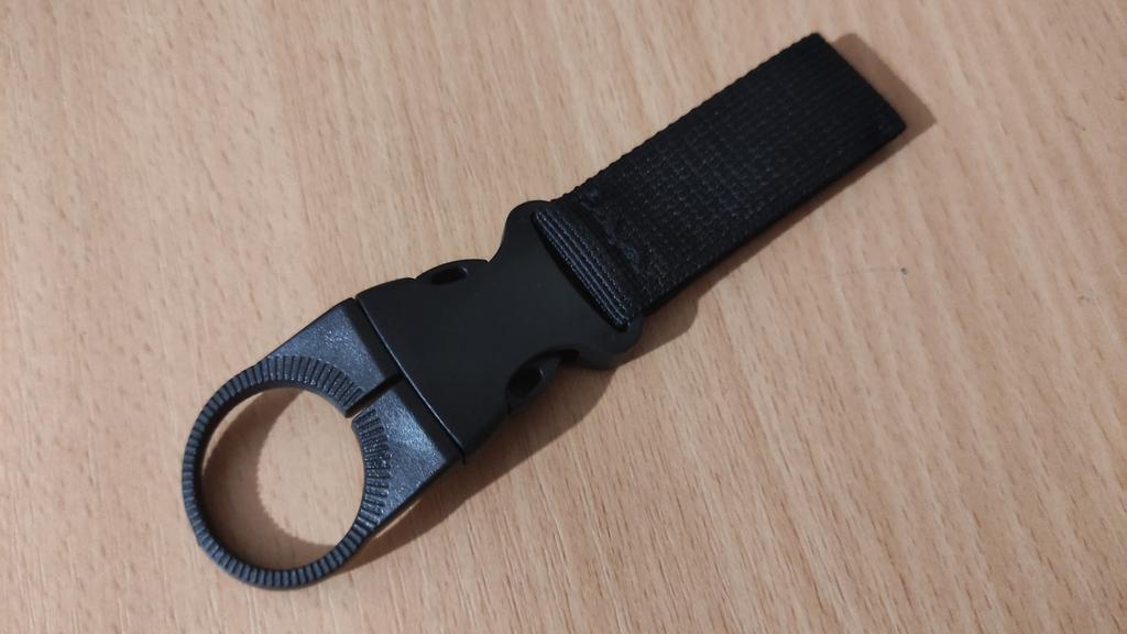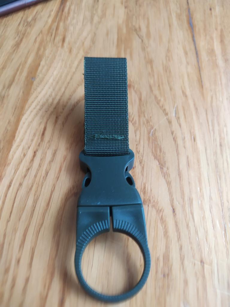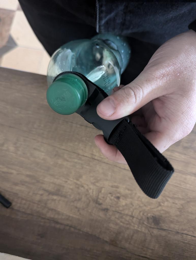 Funciona bem em uma garrafa de 50cl Vitel (ou outras). Anexado à mochila, não cai.