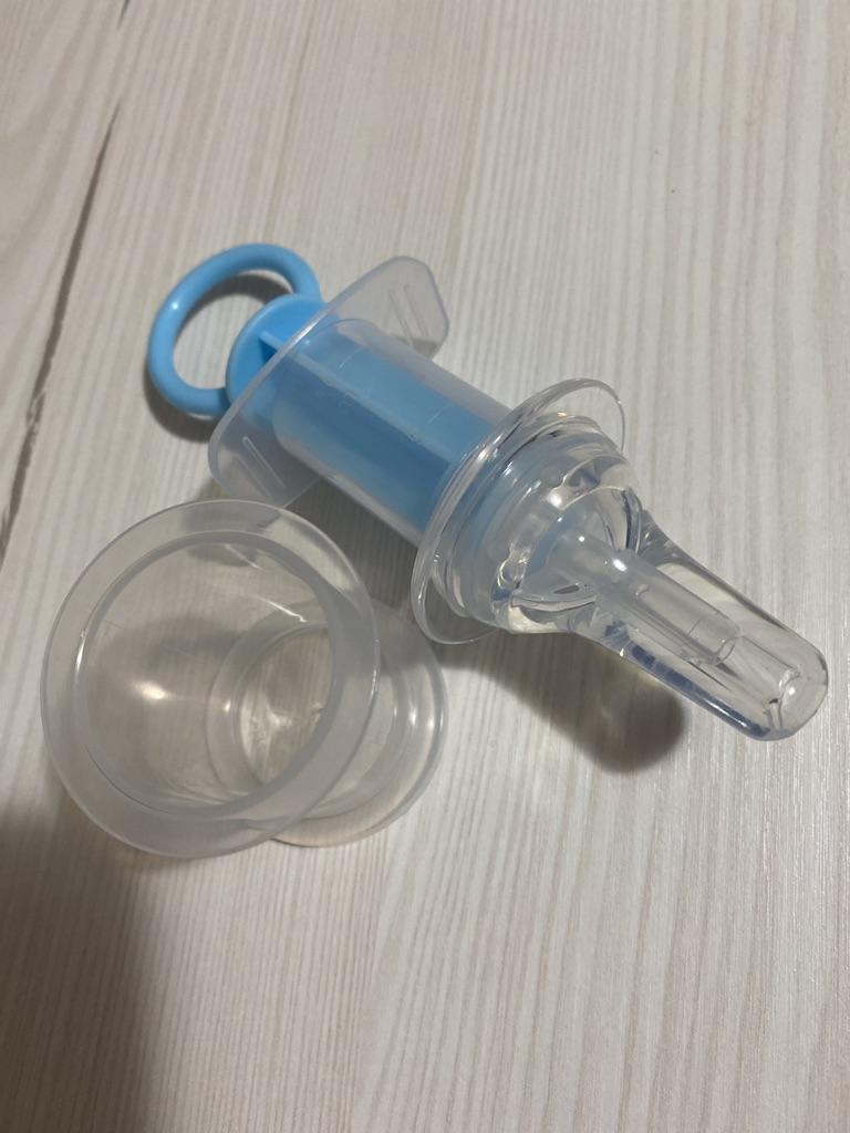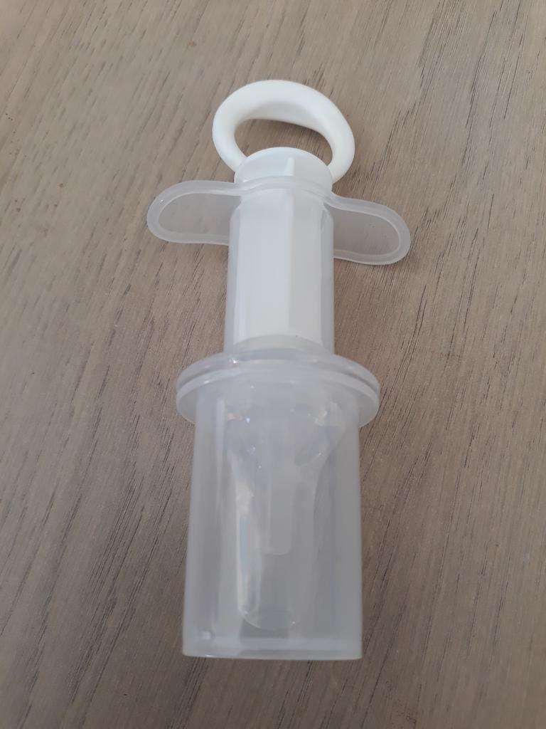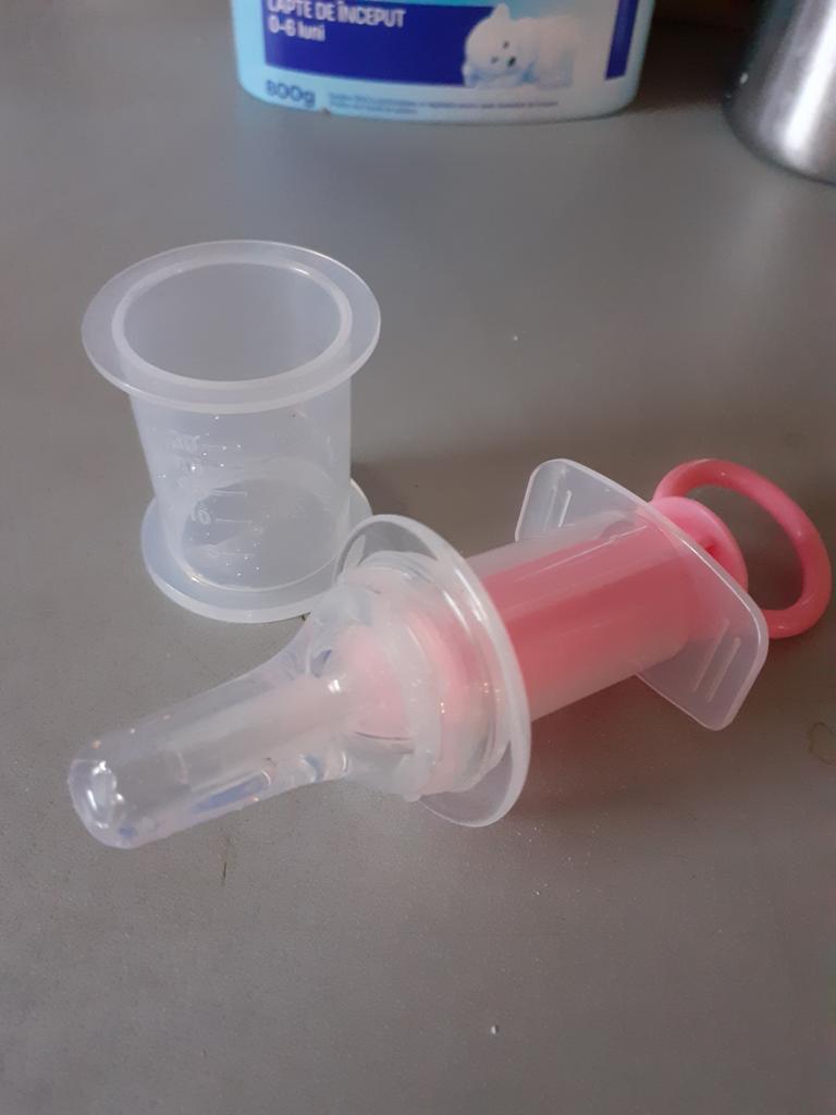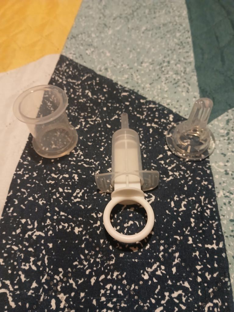 Seringa muito boa. Mamilo de silicone com dois furos, macio. Removido. Há um copo medidor onde você pode injetar o medicamento. Eu recomendo.
