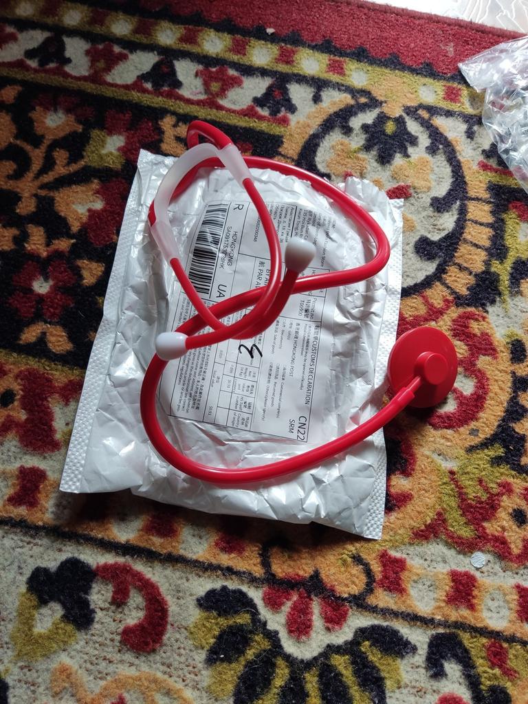 Um estetoscópio como um verdadeiro. Qualidade feita - você pode ouvir os batimentos cardíacos, mas mais fracos que os reais. Eu recomendo
