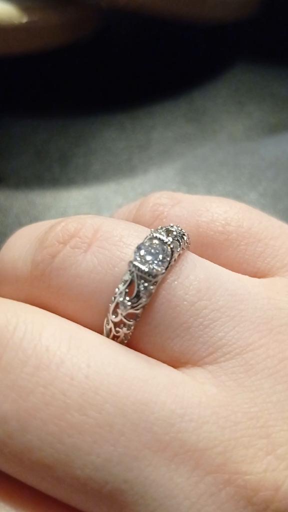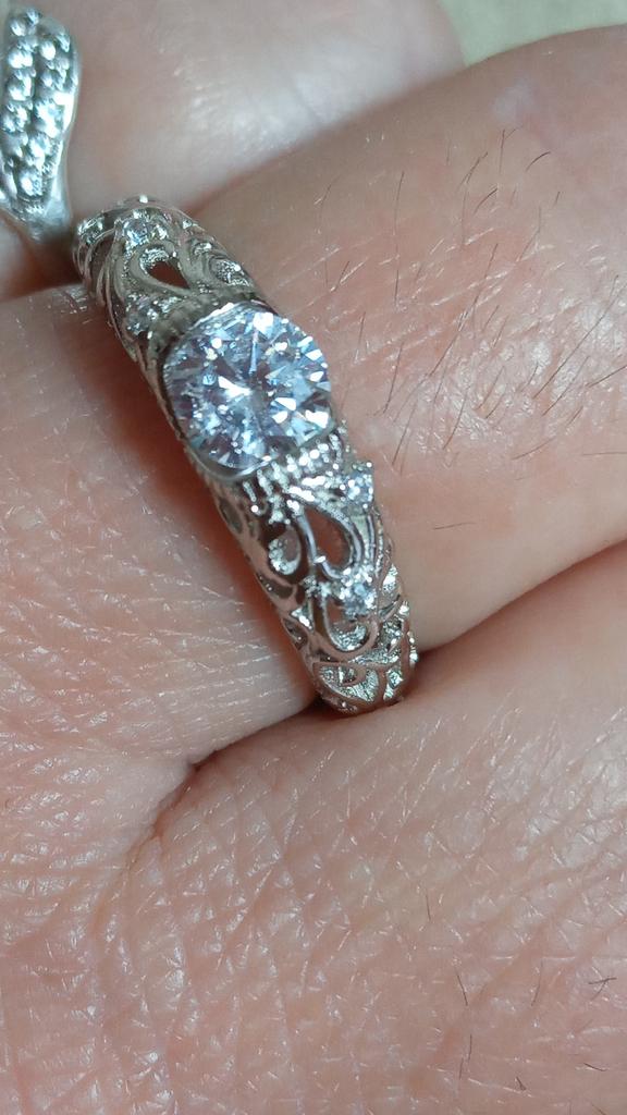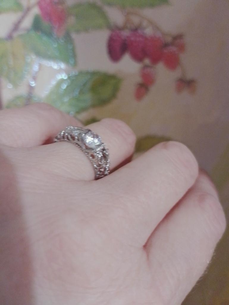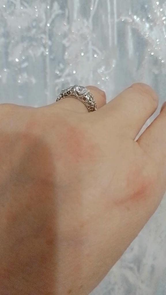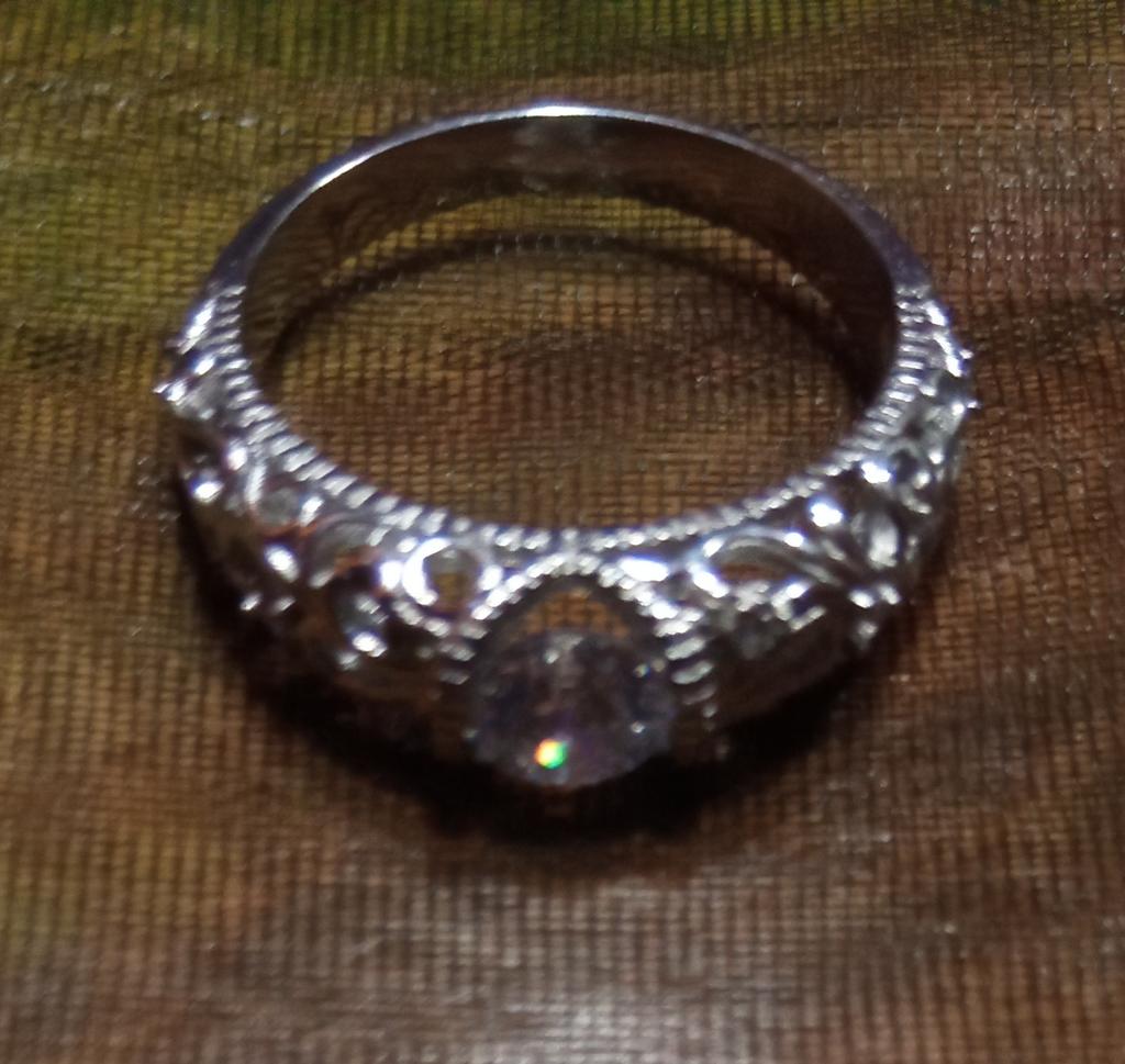 O anel é fiel ao tamanho. É realmente banhado a prata, há uma pedra transparente no meio, há uma marca registrada. Parece simples, não pretensioso.