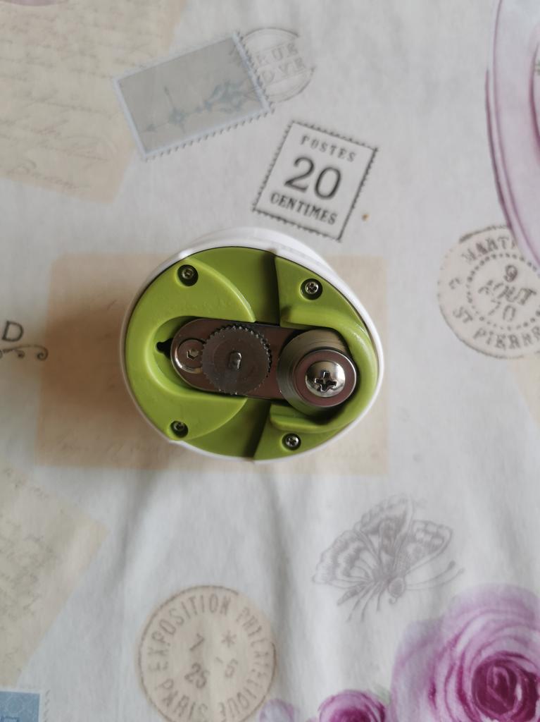 No topo do abridor de latas, um pequeno pedaço de plástico estava faltando. Consegui encontrá-lo na embalagem, mas não consegui consertar. Vou enviar-lhe fotos.