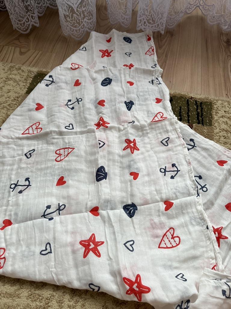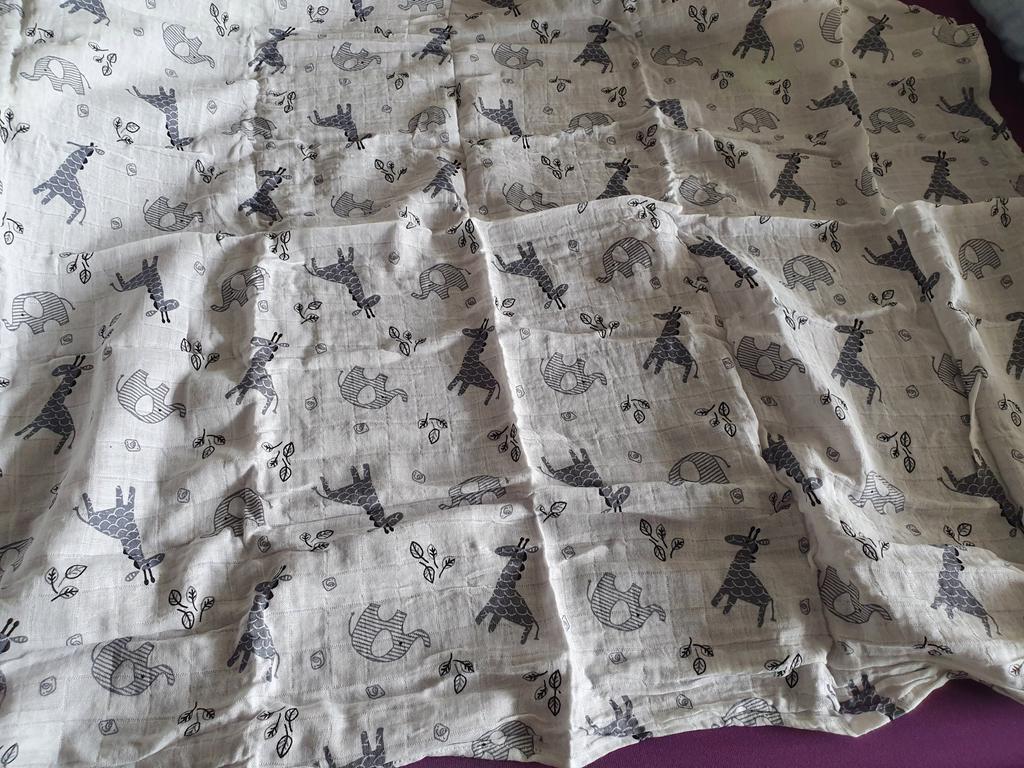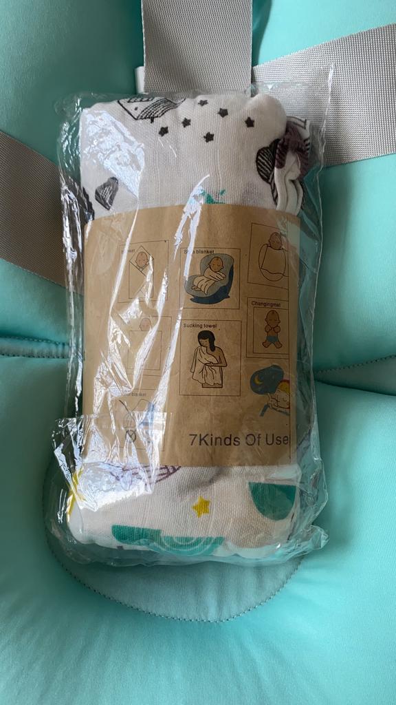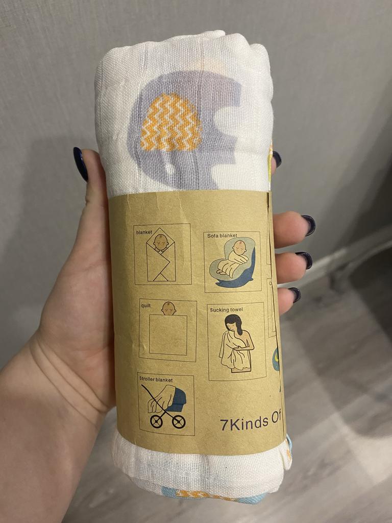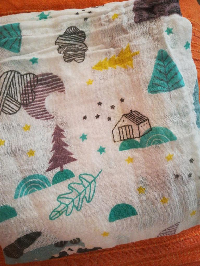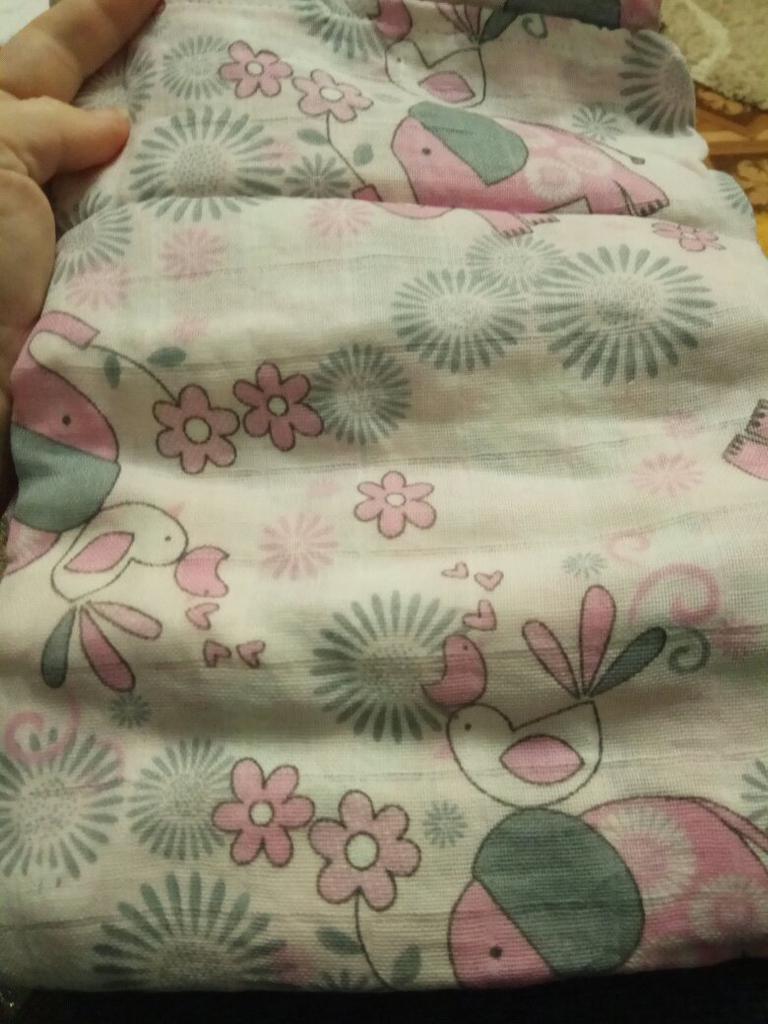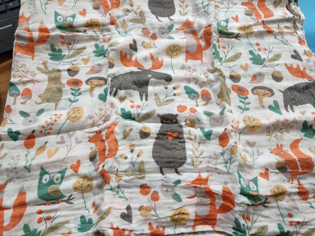 Uma fralda bonita e de alta qualidade, fina, embora eu esperasse que o número de camadas de musselina fosse maior, pois estava escrito que era um cobertor. Entrega rápida.