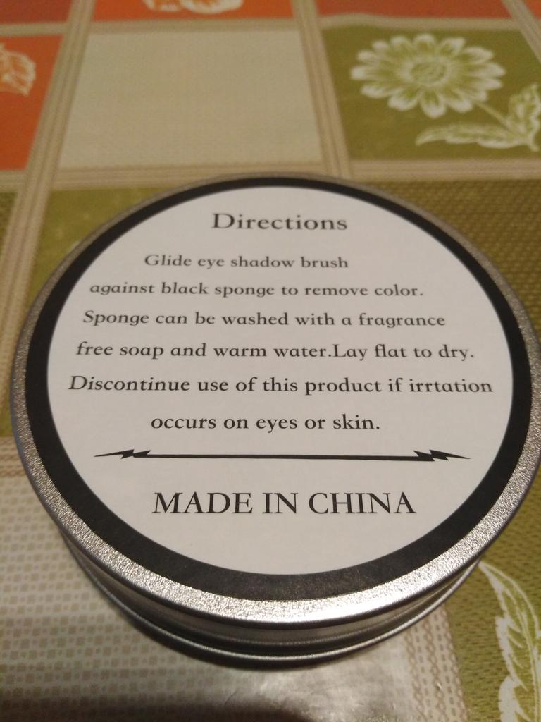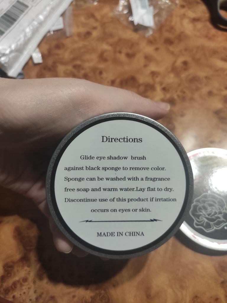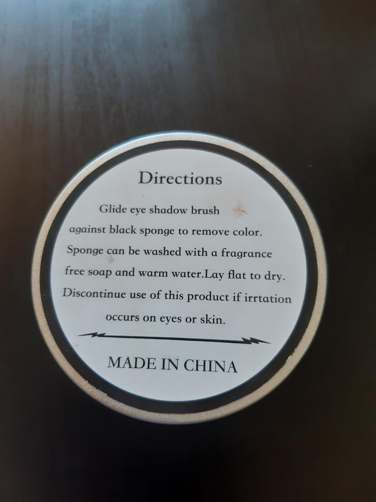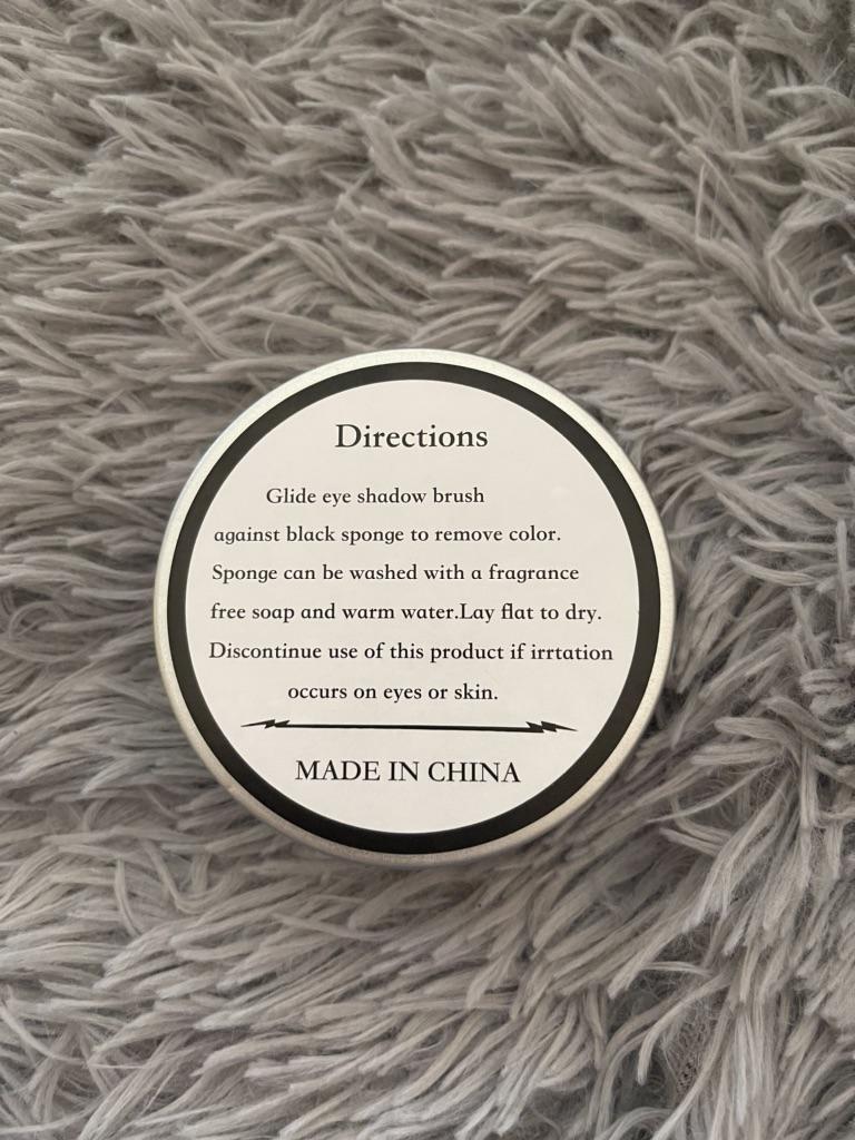 Limpador para pincéis de sombra em pó e blush, basta esfregar os pincéis na esponja preta, também pode ser lavado e usado novamente. O fabricante nos informa que se notar desconforto nos olhos ao usá-lo, não use. Já usei mais vezes e até agora não tive problemas, mas é bom que relatem.