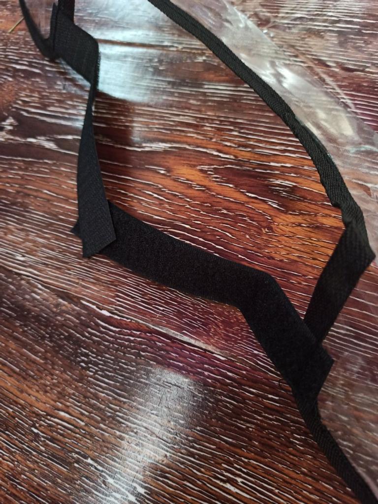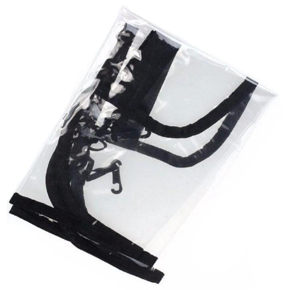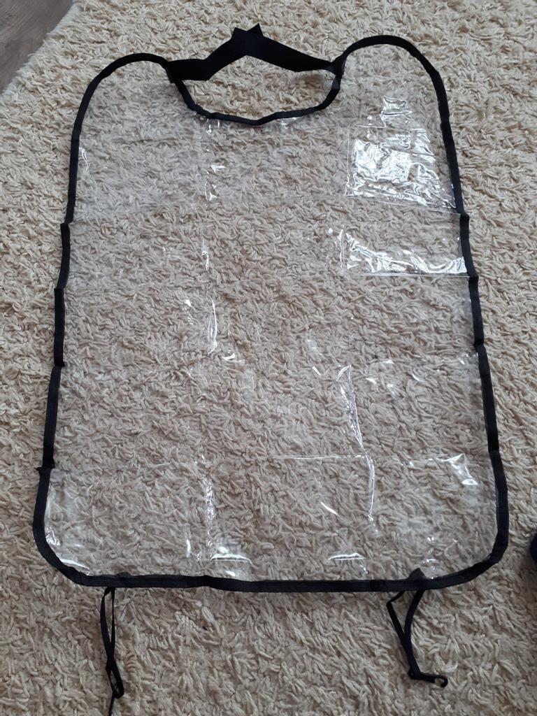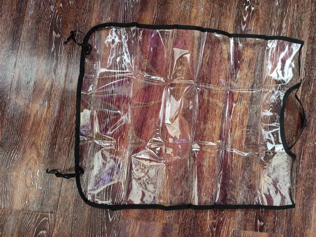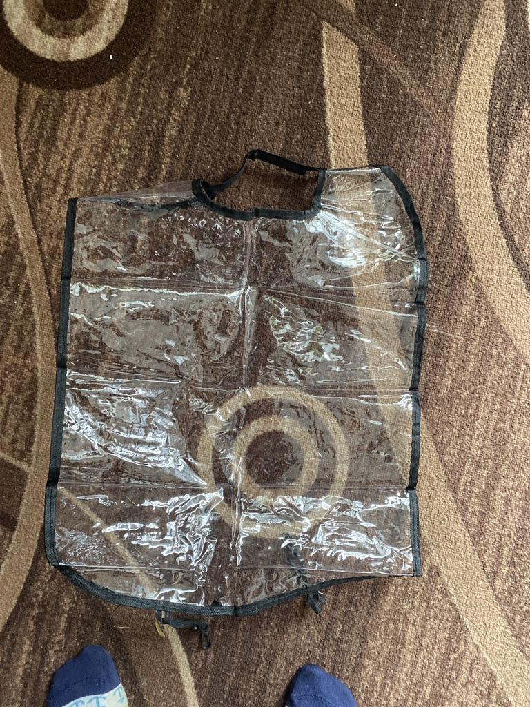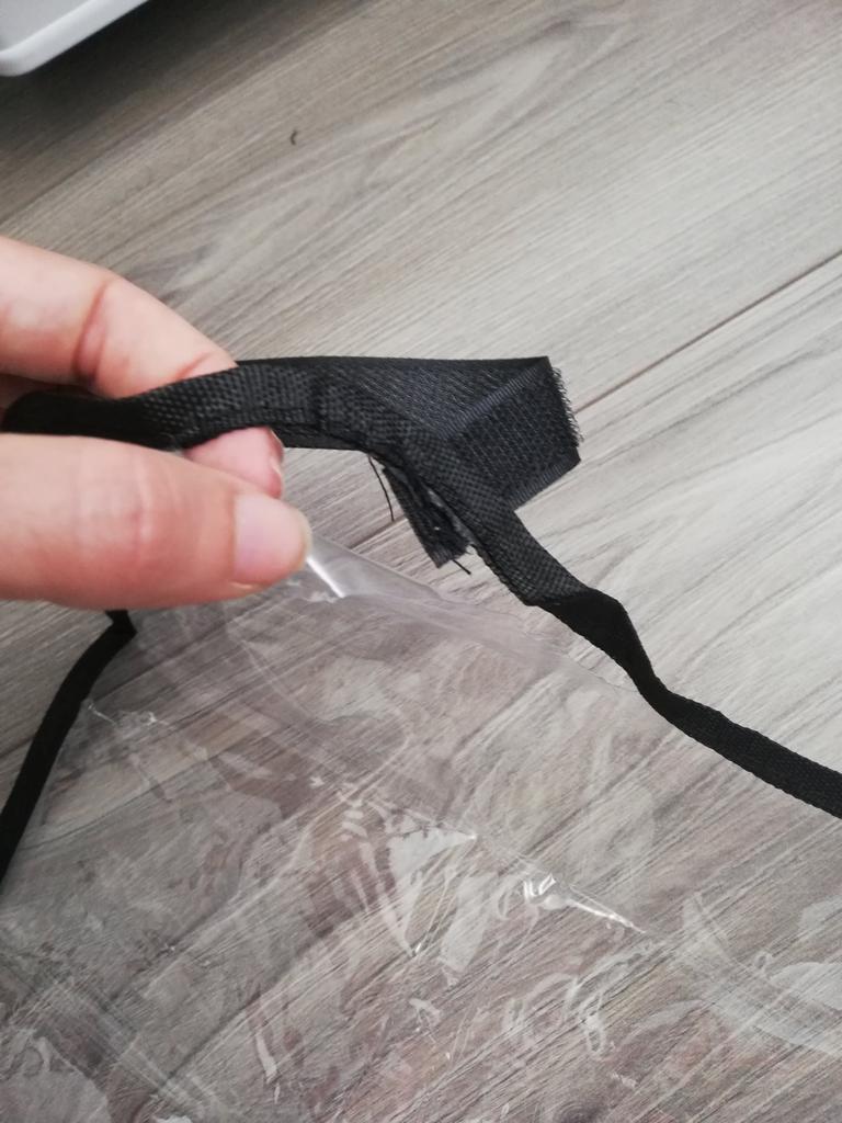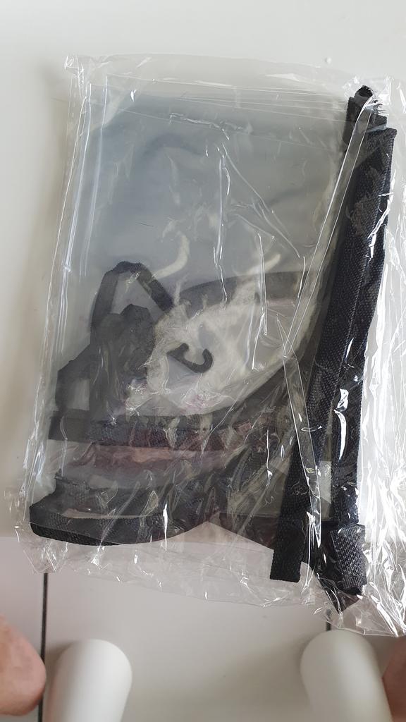 Um saco plástico comum, com fechos, o material lembra uma capa de chuva de carrinho. Há um cheiro, não crítico, faz o seu trabalho.