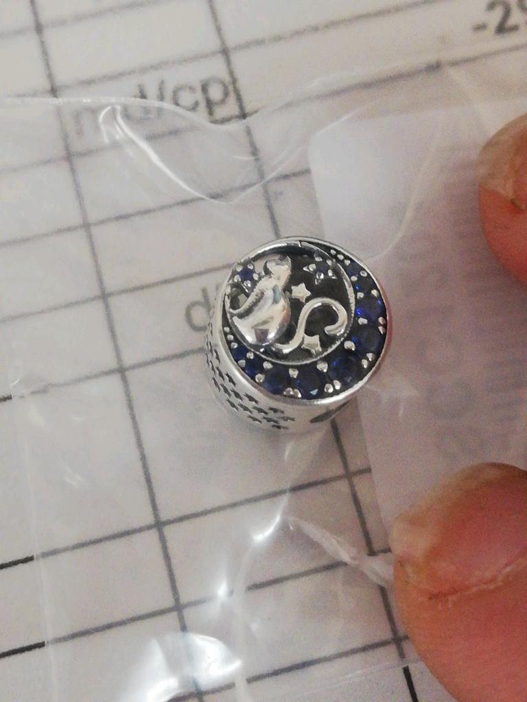 Estou um pouco decepcionada, imaginei que o pingente prateado com motivo de gato e pedras azuis brilhantes fosse maior. Uma pequena bolsa ainda está incluída. 🦋
