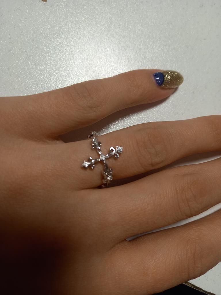 Lindo! Muito bem!!! A sua filigrana, adornada com minúsculos diamantes, torna-a muito elegante. Também se adapta ao dedo porque é aberto. Não se encaixa muito, no entanto.
