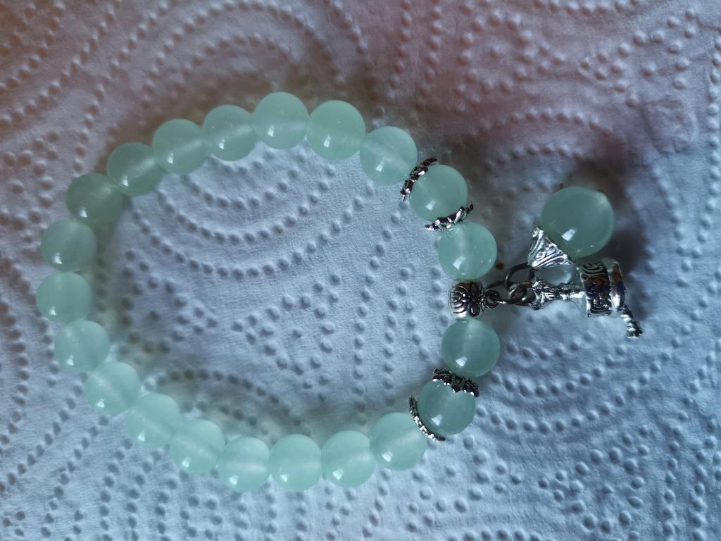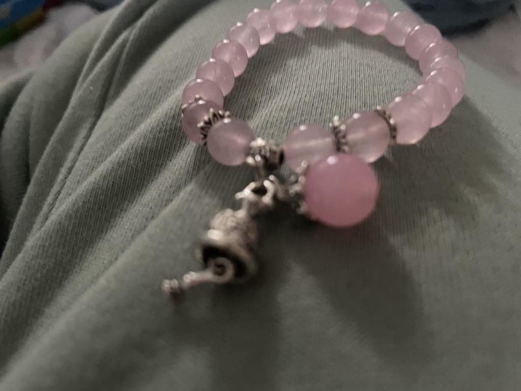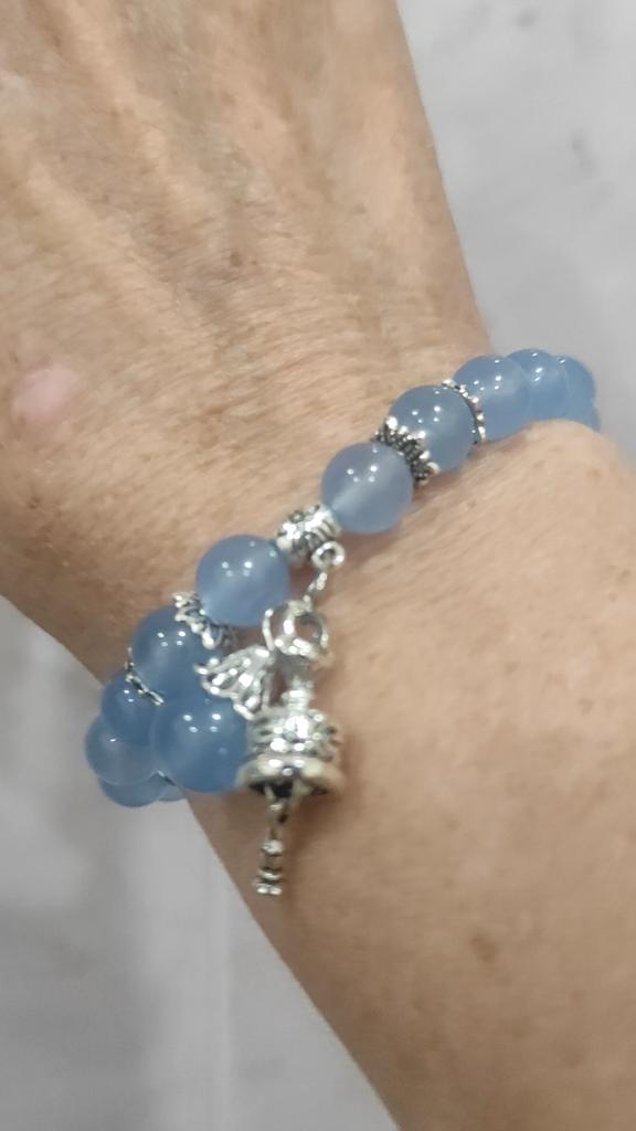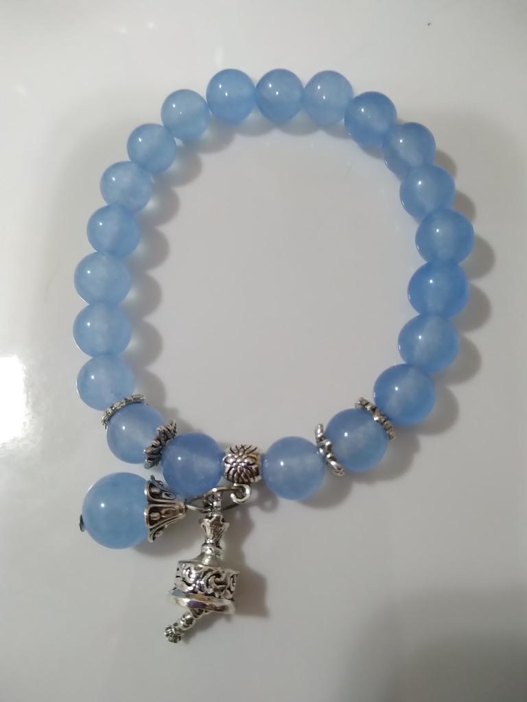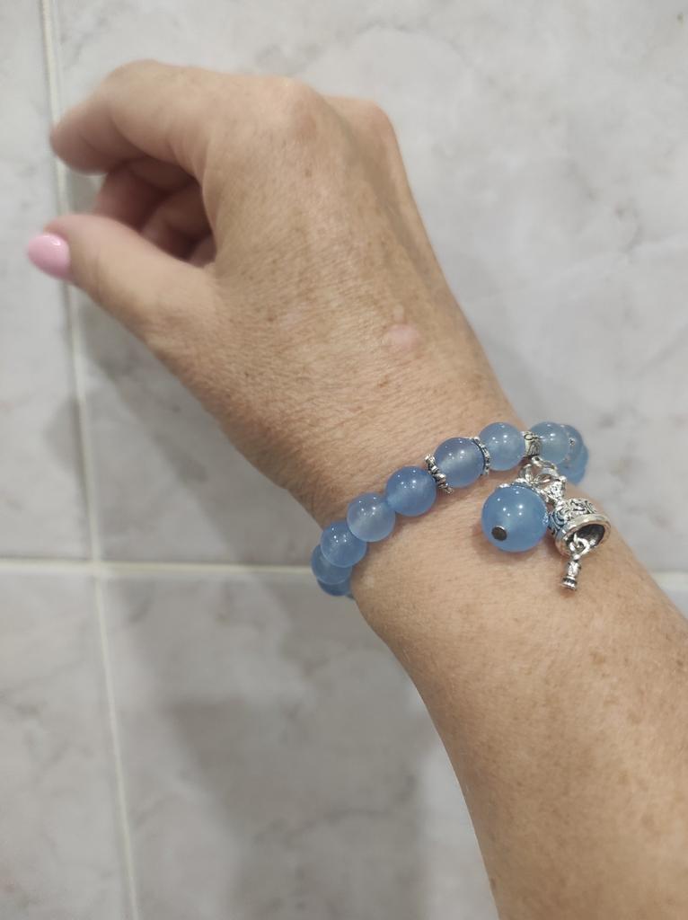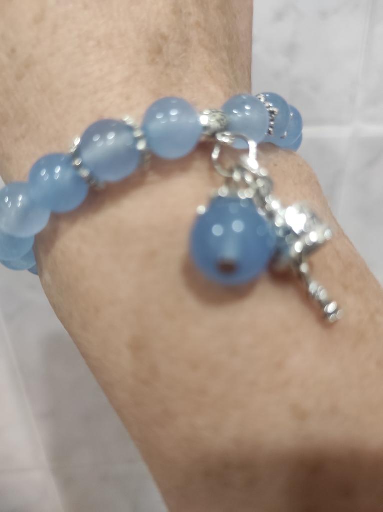 Uma linda pulseira. Parece ordenado. Encaixa muito bem com o elástico. Um azul bem claro. Alegremente de novo e de novo. As pedras são reais e o pequeno charme é incrível.