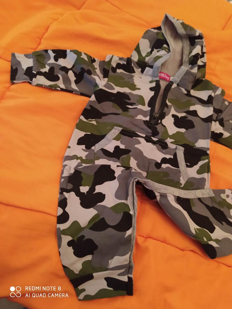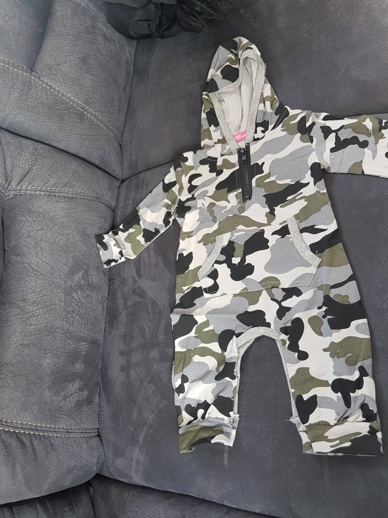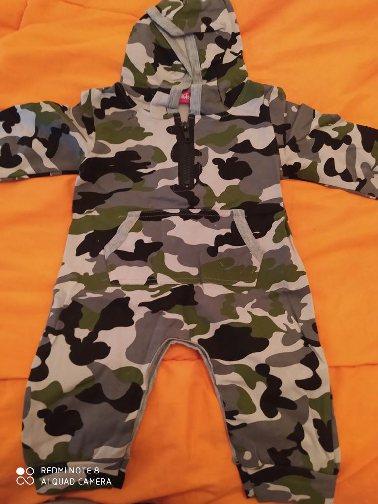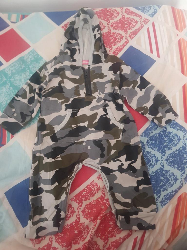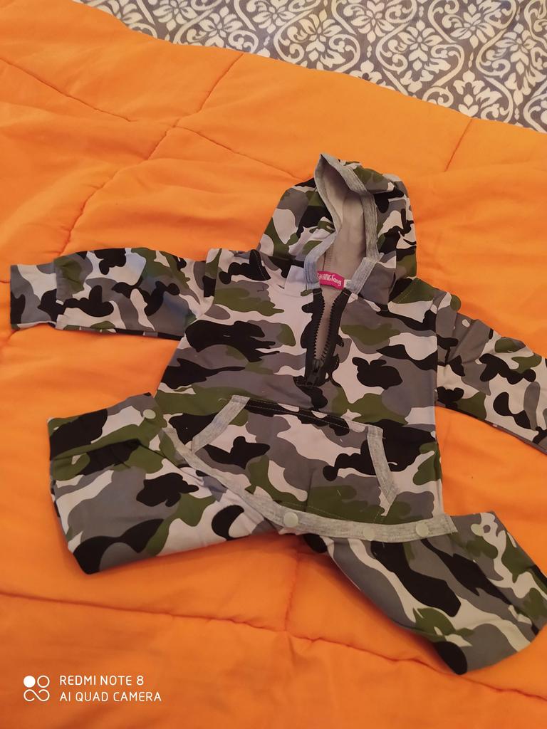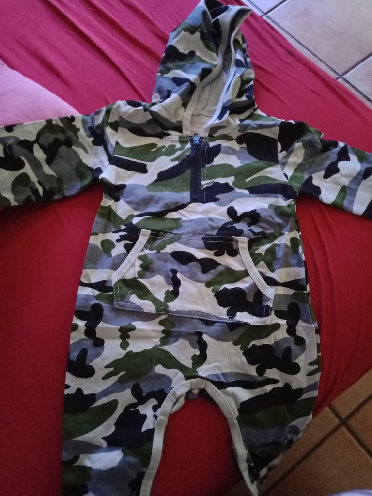 Roupa muito bonita. Bolso pequeno na barriga. Pressões entre as pernas. Acabamentos corretos.