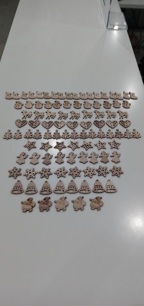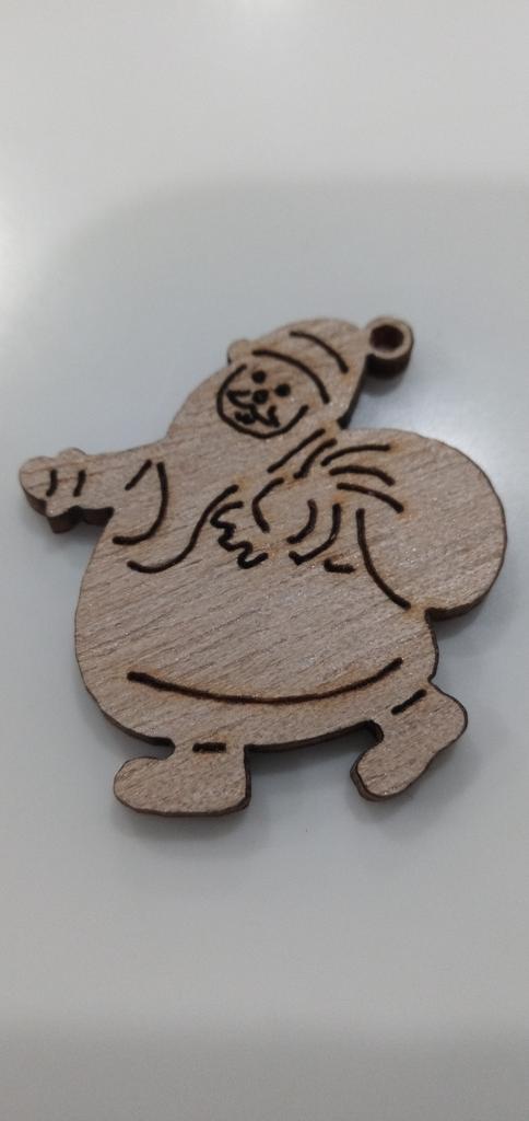 Figura de madeira muito bonita, bem recortada. Há flocos de neve, veados, abetos, sinos. Meias, corações, estrelas, anjos e bonecos de neve e Papai Noel