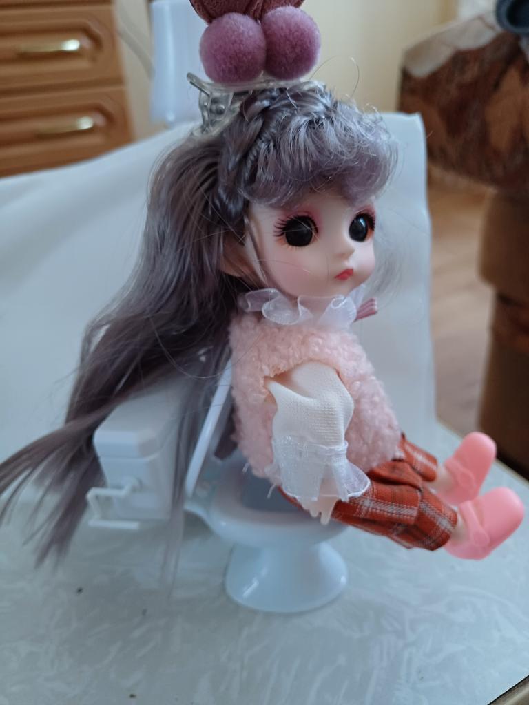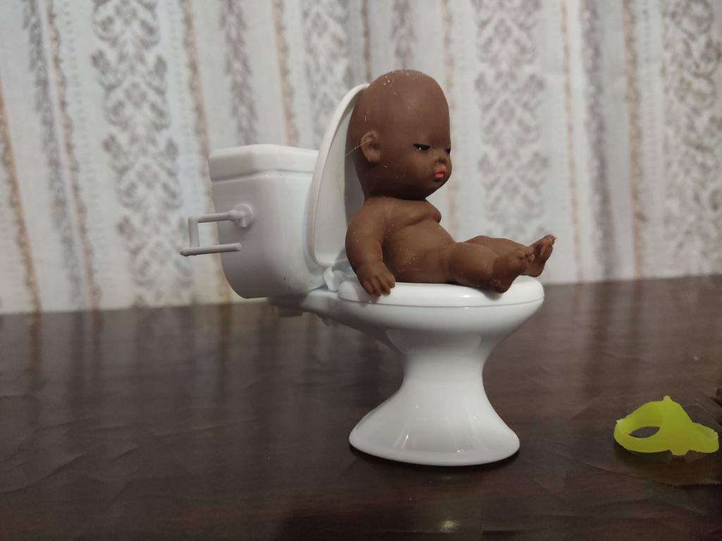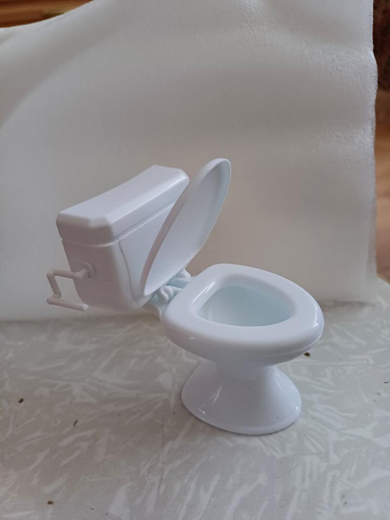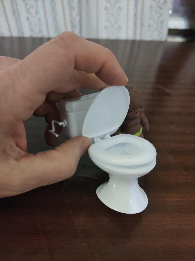A sanita não é má. Mas a tampa não abre mais. Para referência, a boneca tem 15 cm.
