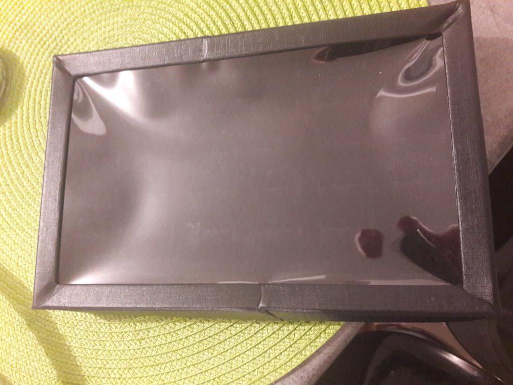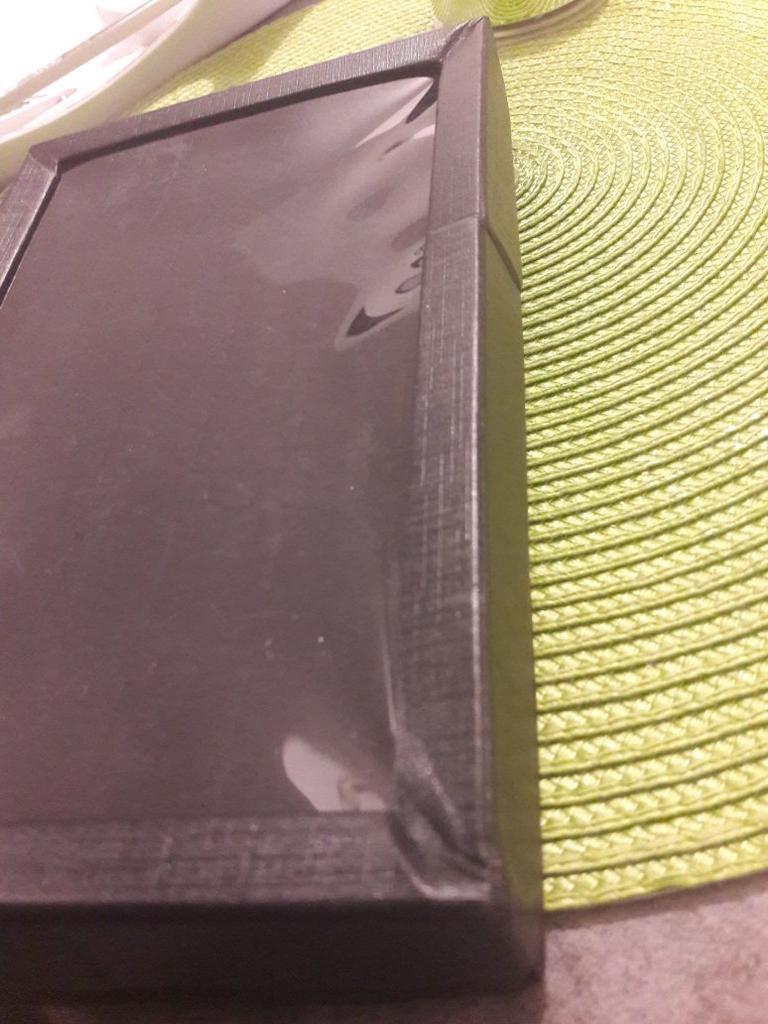 Chegou com a película descascada, amassada na base e na tampa. É feito de papelão fino. Pode ser mais