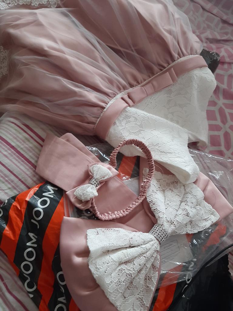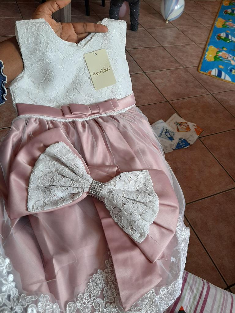 Cor forte. Grande laço. Infelizmente, o tecido está um pouco desgastado e as costuras são mal feitas e pouco profissionais aqui e ali. Mas, caso contrário, estou satisfeito, transporte rápido, boa embalagem. Não tem cheiro de química. Corresponde aproximadamente a um tamanho alemão 110/116. Muito obrigado. Alegremente novamente.