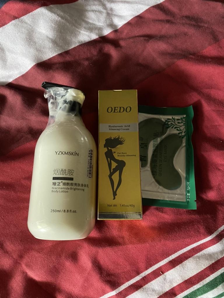 creme de emagrecimento Creme de ginseng e ácido hialurônico, não testado em animais (cruelty free). Desde o início a textura é leve, é facilmente absorvida, com um cheiro forte mas agradável, não me deu uma sensação de calor no momento, apliquei para dormir. vou tentar com um filme. O tamanho do pacote parece muito pequeno. Continuarei a usá-lo e, se vir resultados, compartilho-os. Veio bem embalado, e junto com ele veio uma amostra de presente, demorou entre 15-20 dias para chegar na Espanha.
