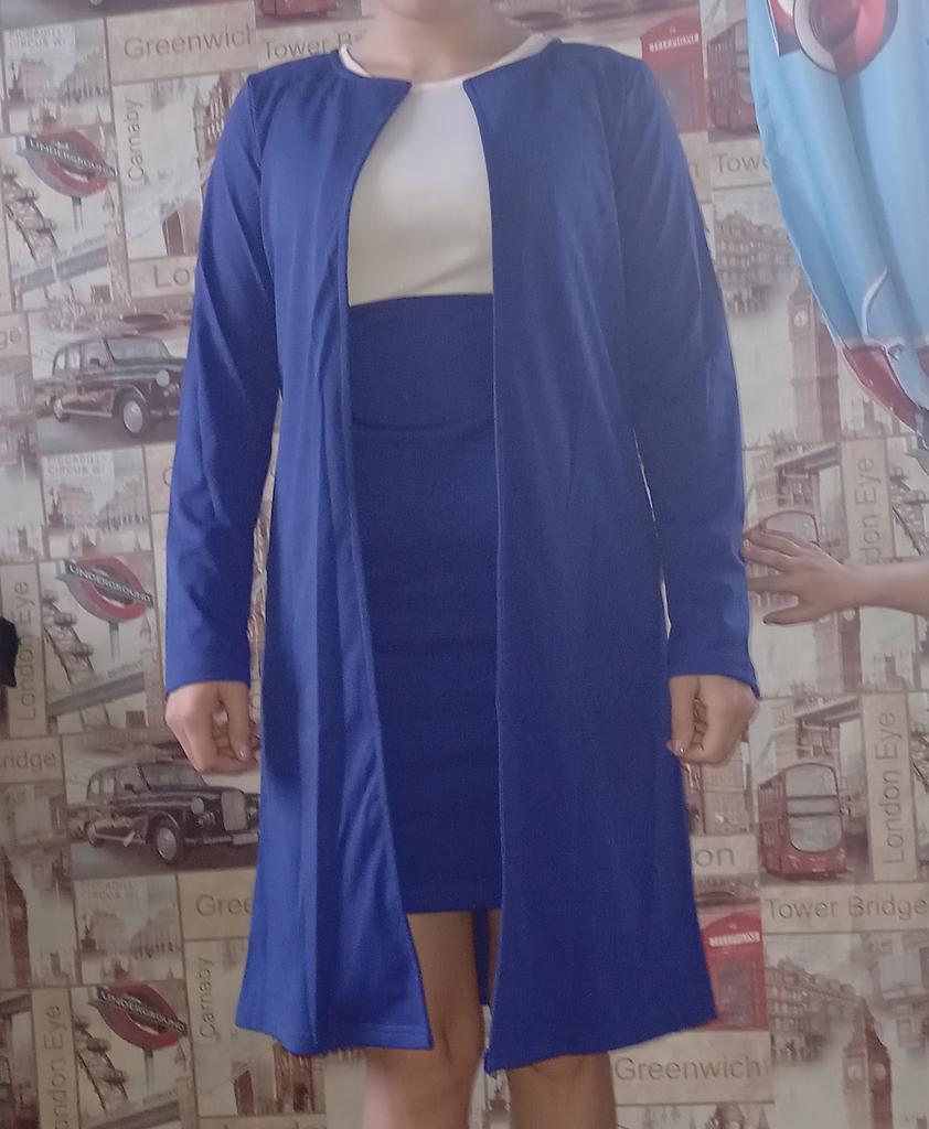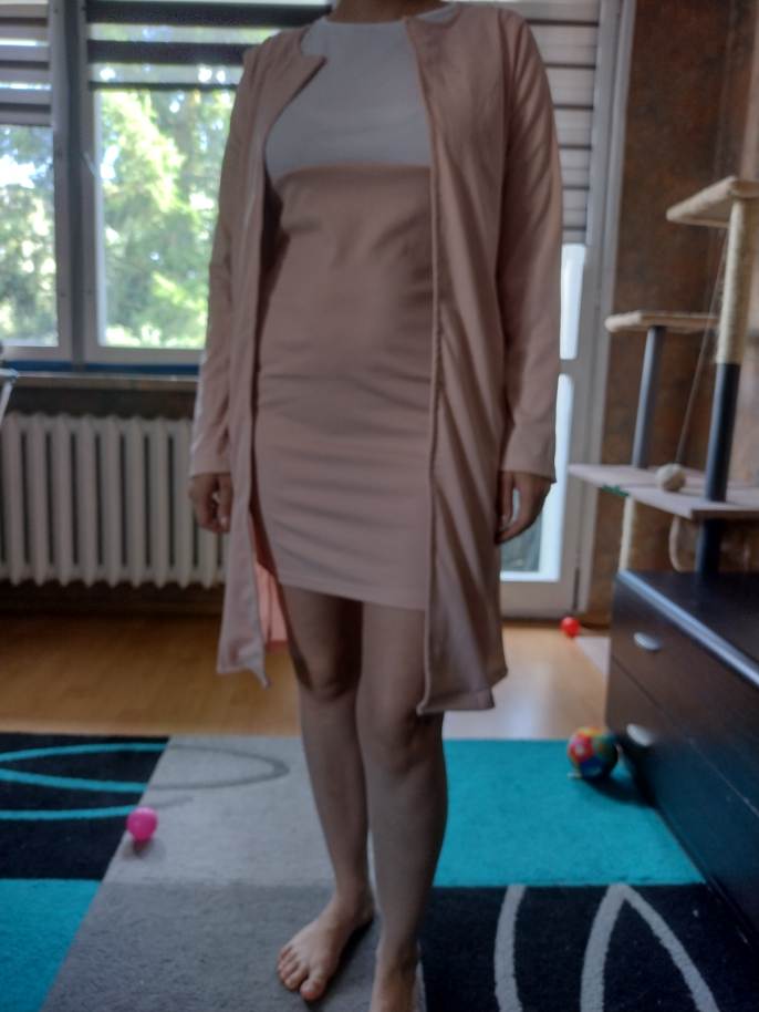 A jaqueta é um pouco longa, ainda não tenho certeza sobre o vestido, pois ainda não experimentei