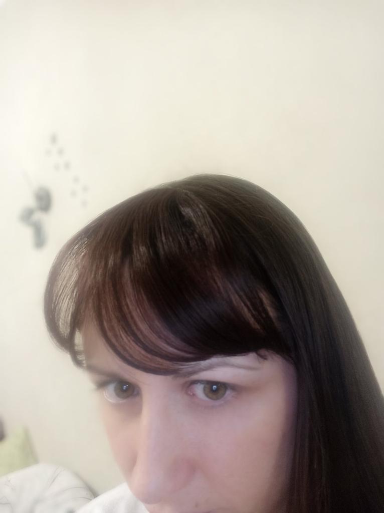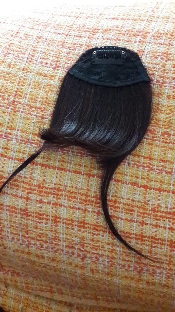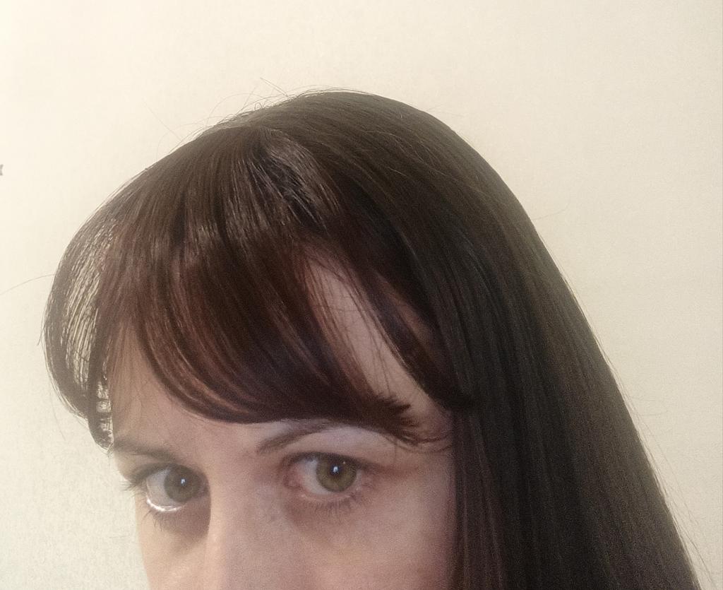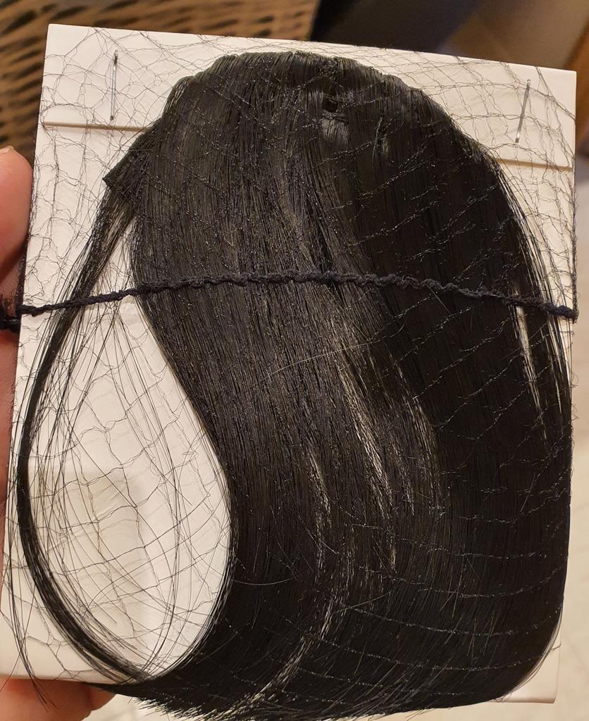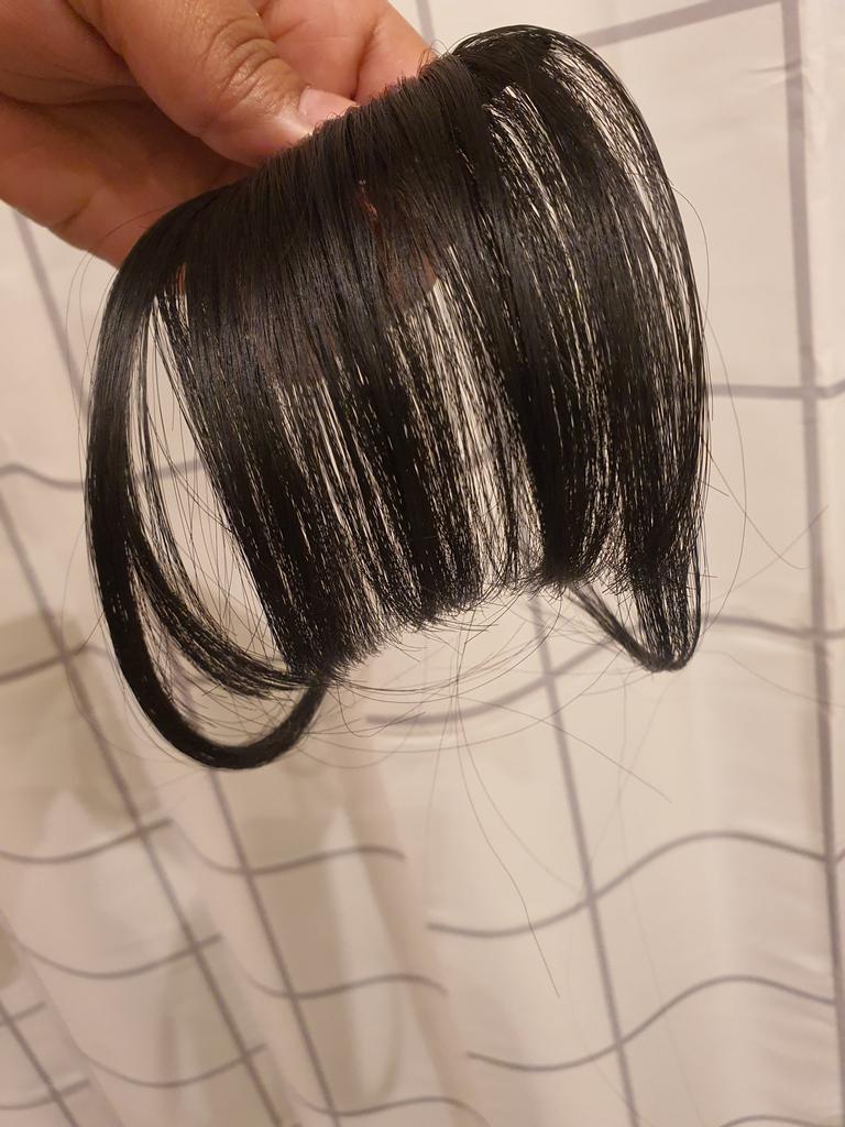 Não é muito diferente do meu cabelo. Não há brilho natural. Coisas legais para variar. Principalmente se você precisar cobrir temporariamente a testa ou de repente quiser fazer uma franja, mas não quiser cortar o cabelo. Mas é preciso cobrir o local onde está fixado com alguma coisa, por exemplo com um bastidor, pois a transição é perceptível de perto. E então estou feliz.