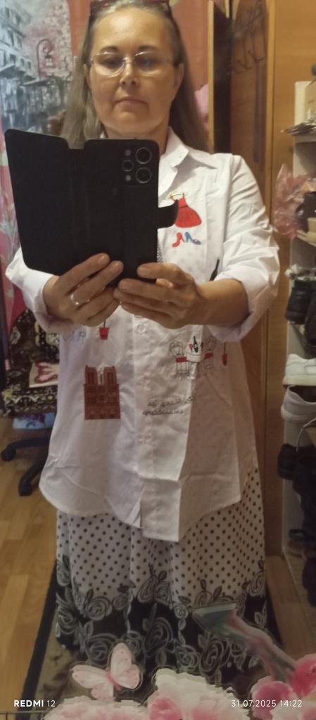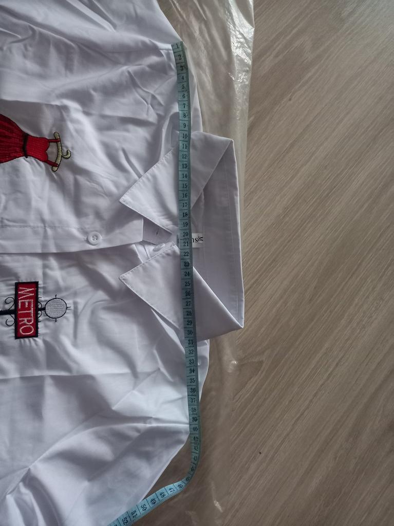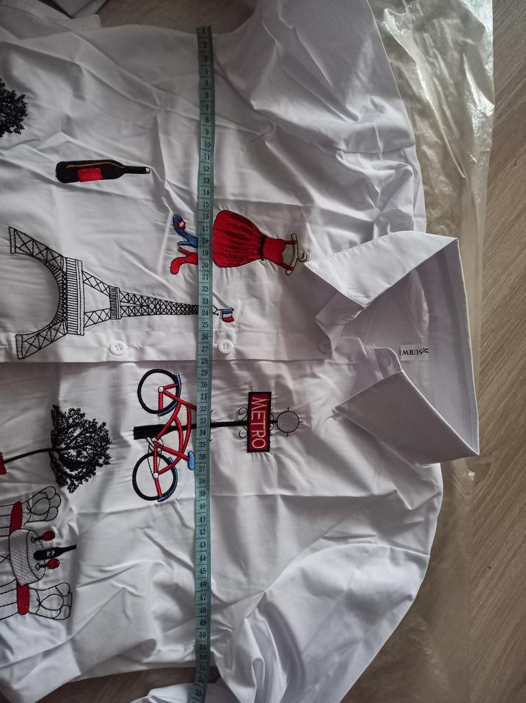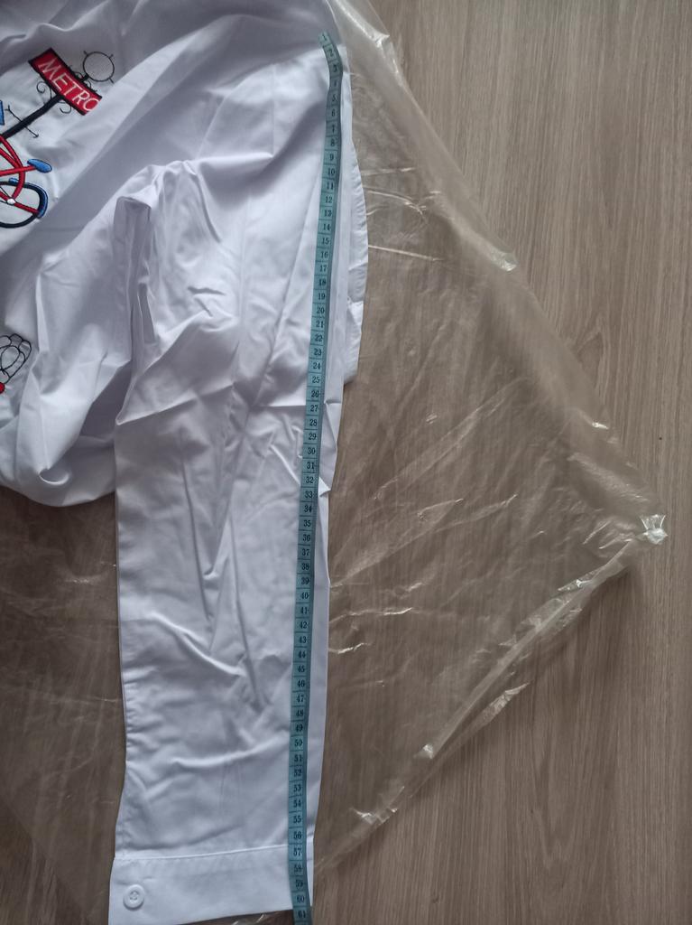 A blusa é muito bem costurada, todas as costuras estão uniformes, veio bem embalada. O tecido é branco como a neve, o bordado é bem feito. A composição do tecido não está indicada na etiqueta, mas é poliéster de alta qualidade, sem stretch, que costuma ser usado em camisas brancas femininas. Há uma diferença entre a tabela de tamanhos e as medidas reais. Concentrei-me mais nas avaliações, então acertei e agradeço a quem deixa avaliações detalhadas e significativas. Medidas reais de R.M.: ombros - 39 cm; perímetro torácico-106 cm; manga - 60 cm; comprimento nas costas - 76 cm.
