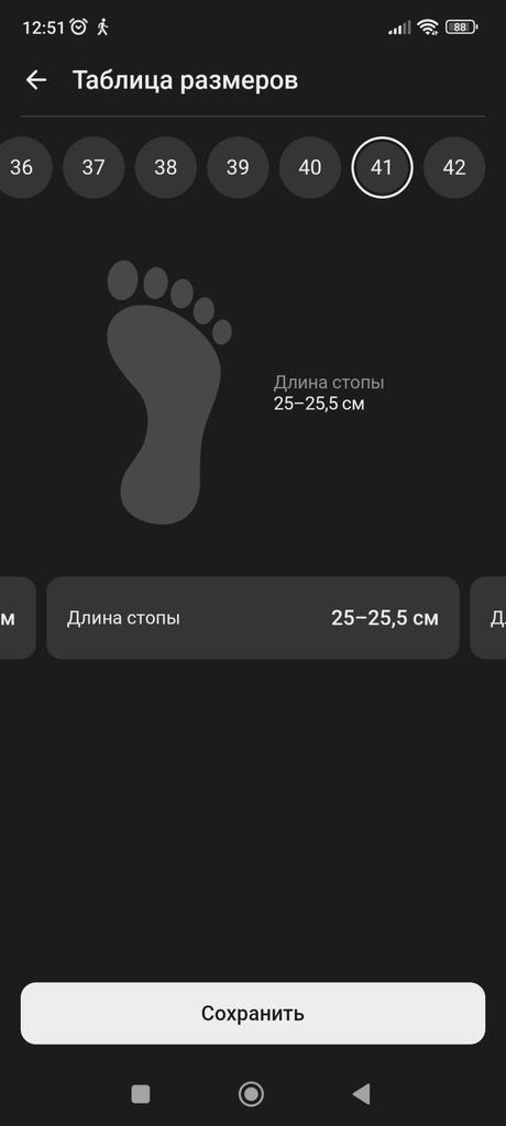Encomende para o tamanho 41. De acordo com a tabela de tamanhos é de 25 a 25,5 cm, chegou o tamanho pedido 41, mas de acordo com a palmilha o comprimento do pé é de 26,5 cm. Se os sapatos de inverno permitirem isso, nos sapatos de verão você verá imediatamente que eles são muito grandes. Caminhar não é confortável.