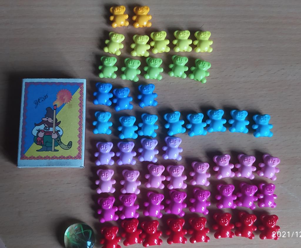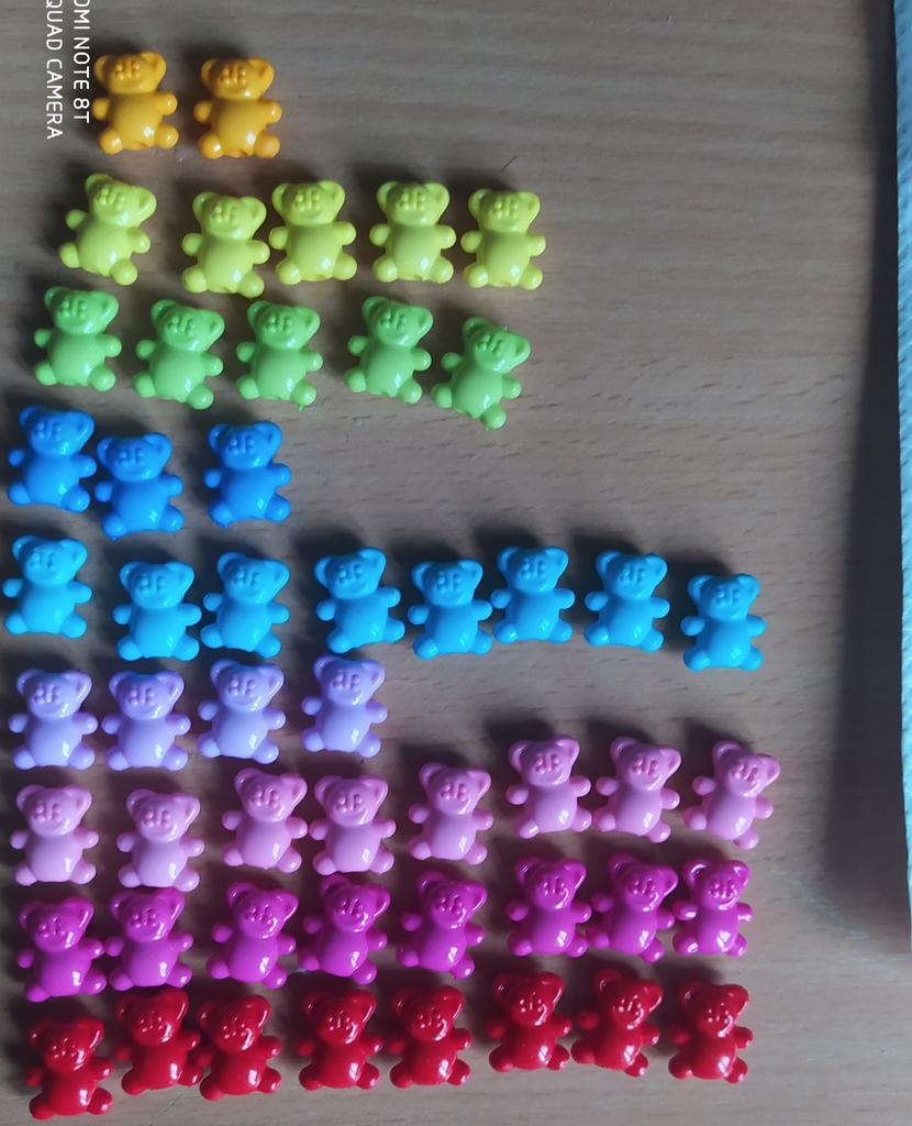 Recebi a encomenda. Há 51 ursinhos - agradável. Uma observação - pelo menos a quantidade aproximada de cores. Todas as cores 9. 4 Cores por - 8 peças. Azuis - 3 peças, laranjas - 2. Bem, e as outras 4-5 Por isso - menos