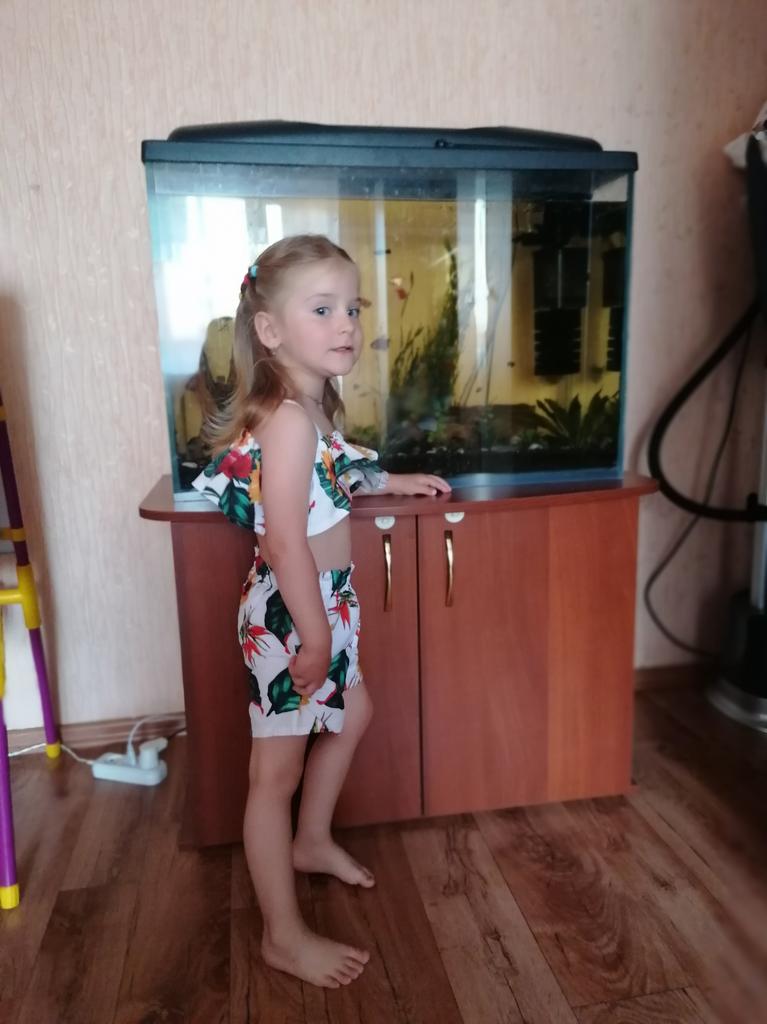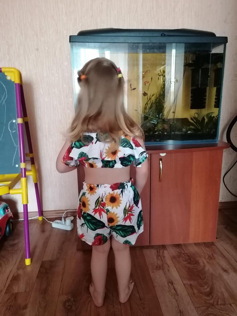 O traje leve consiste em um top curto e shorts. O tecido não é transparente. Fiel ao tamanho, por 2,5 a 3 anos. Este é o look perfeito para uma ida à praia ou diversão aquática à volta da piscina.. A estampa é muito estilosa e brilhante💛