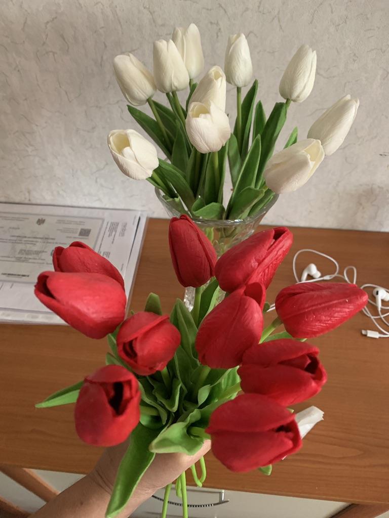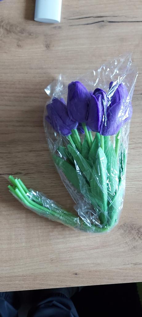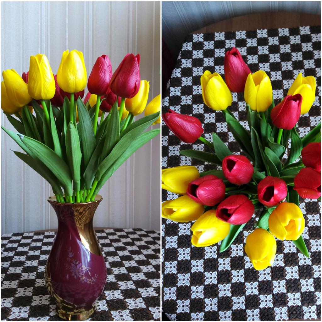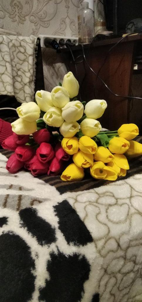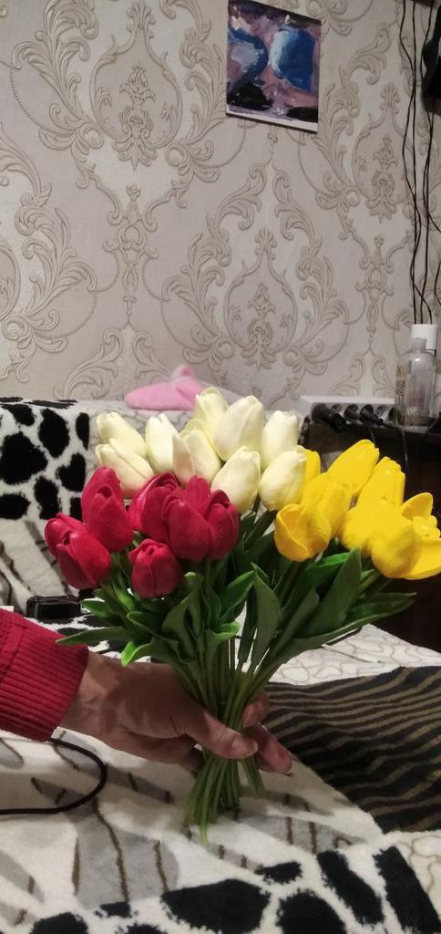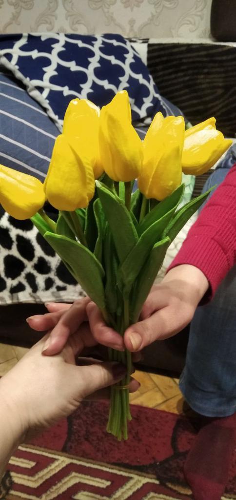 As tulipas encomendadas chegaram à região de Kiev. em 15 dias. (24 de abril a 8 de maio) Demorei para receber Ukrposhta nos fins de semana. As tulipas parecem vivas. Material - espuma macia, dobra bem, endireita facilmente qualquer entrega amassada. Só pelos foto-vídeos apresentados no Jumy eu os imaginei bem maiores. Eu planejei colocá-lo em um vaso maior. Em princípio, satisfeito com a compra. Obrigado pela entrega rápida.