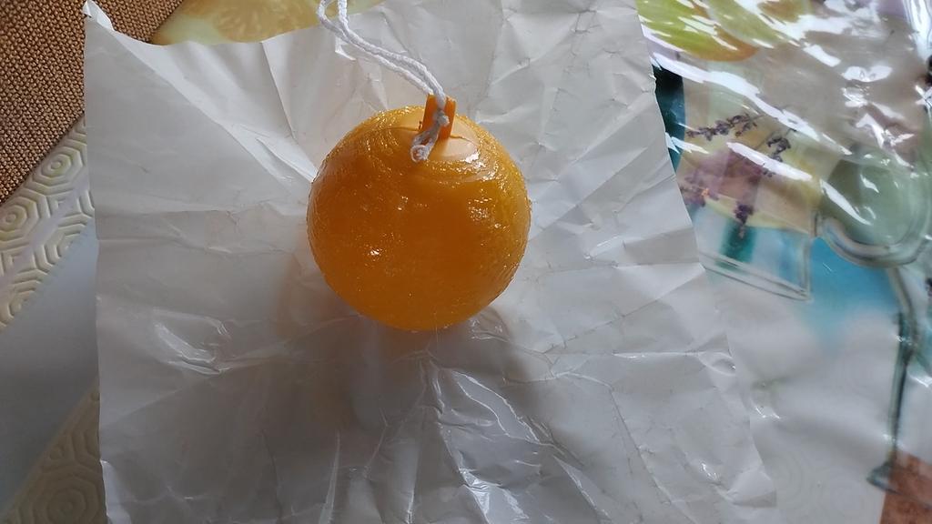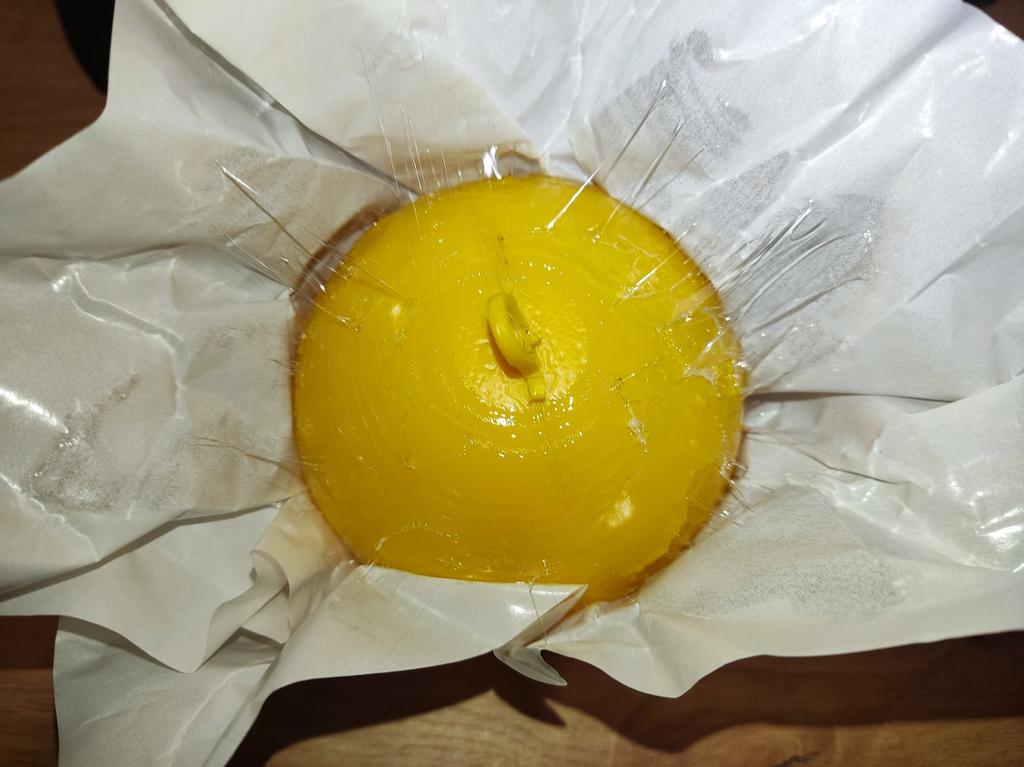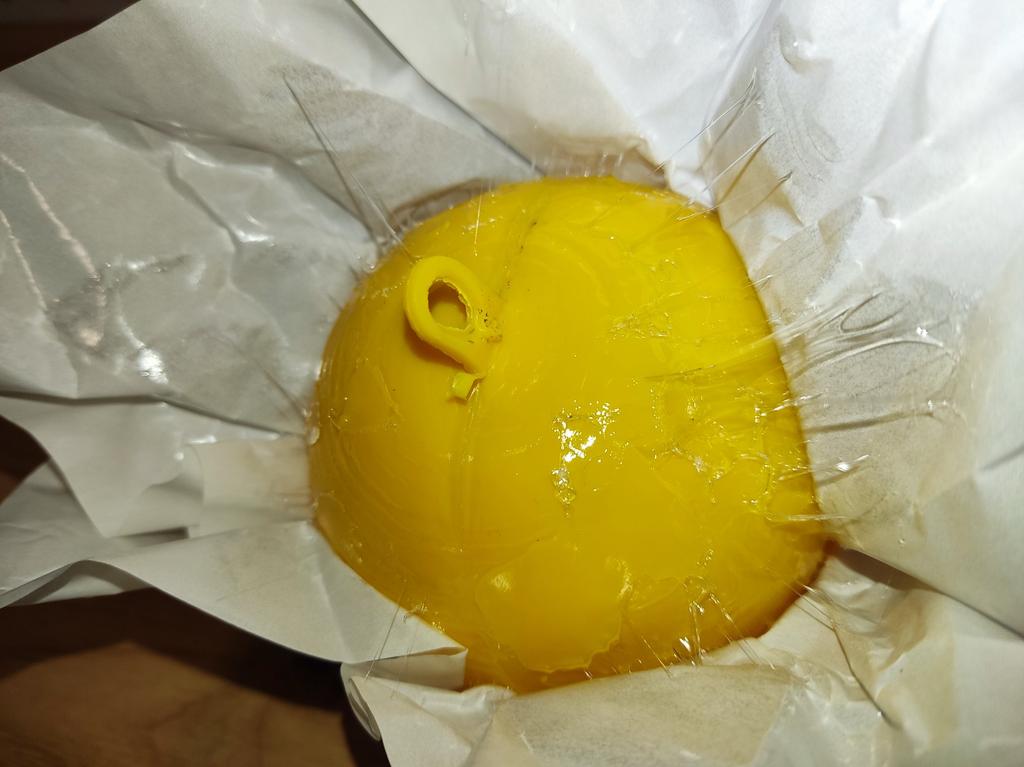 A bola chegou em papel manteiga, coberta de cola. Retire o papel, pendure e pegue as moscas quando elas vierem.