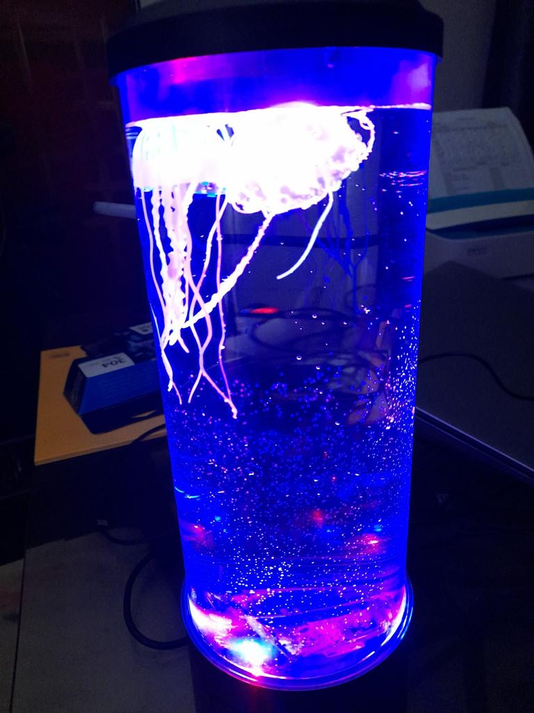 O aquário tem 18 LEDs (seis cada um de vermelho, azul e verde) que mudam automaticamente de cor, fazendo com que ambas as medusas "reagem" por amarelo brilhante, roxo, aquático, azul e vermelho à medida que flutuam dentro de correntes suaves geradas pelo motor silencioso e integrado da unidade.