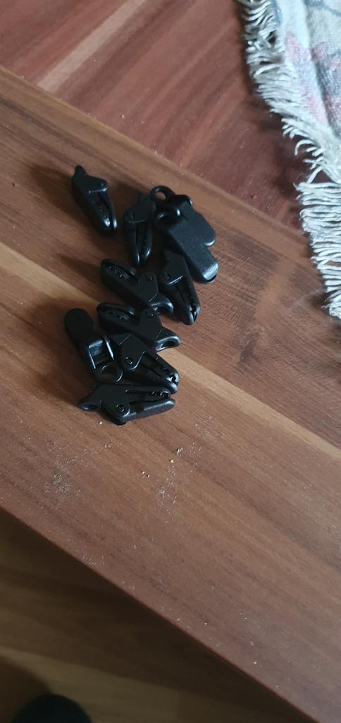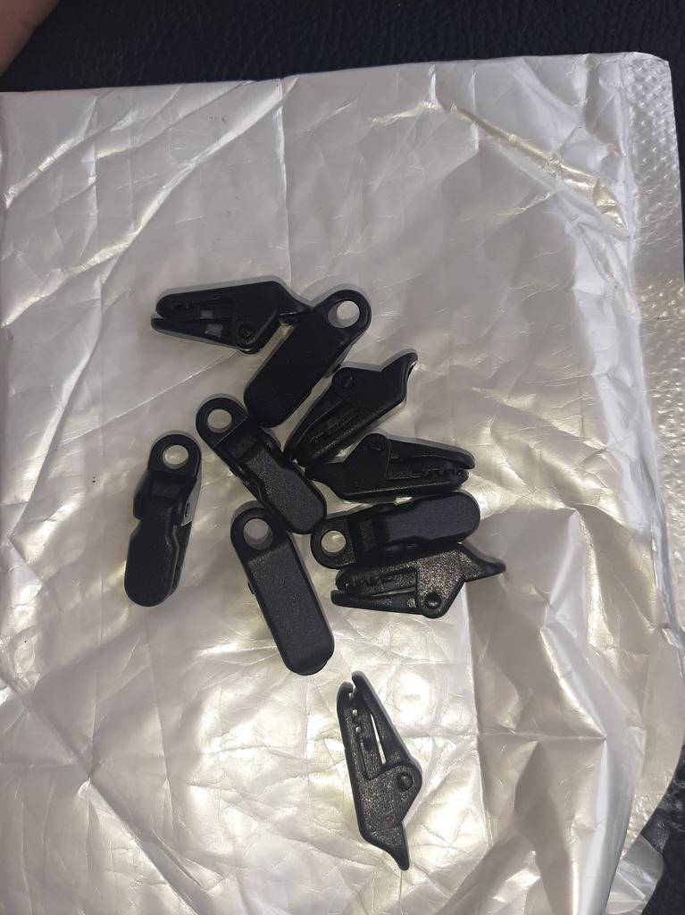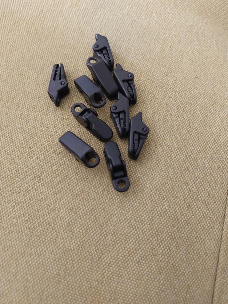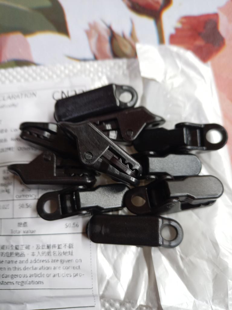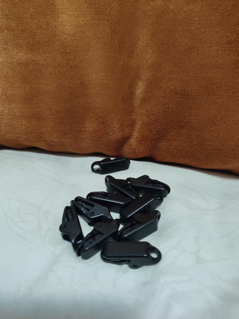 Clipes para esticar toldos, tecidos, polietileno. Para evitar fazer buracos. Há um furo no clipe para o cabo.