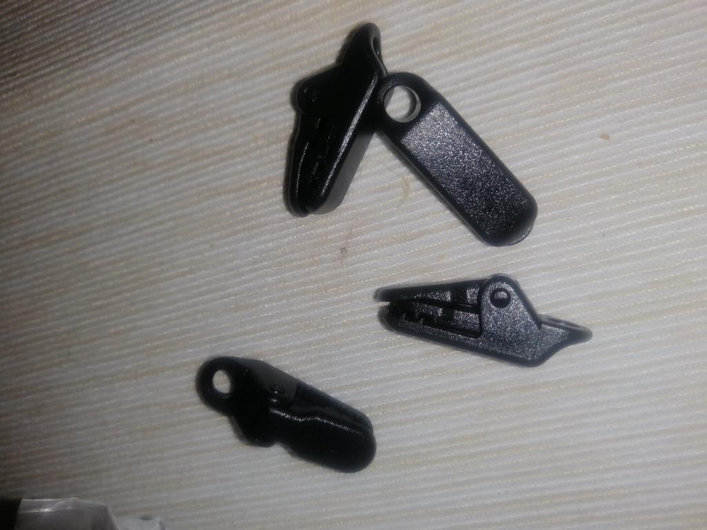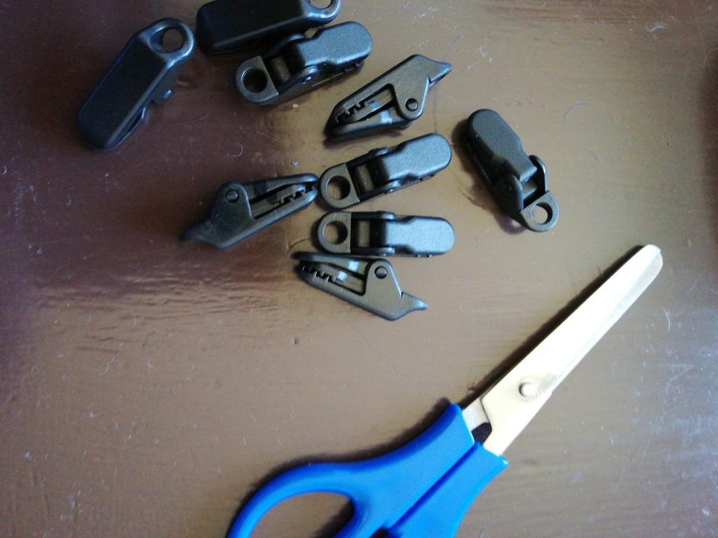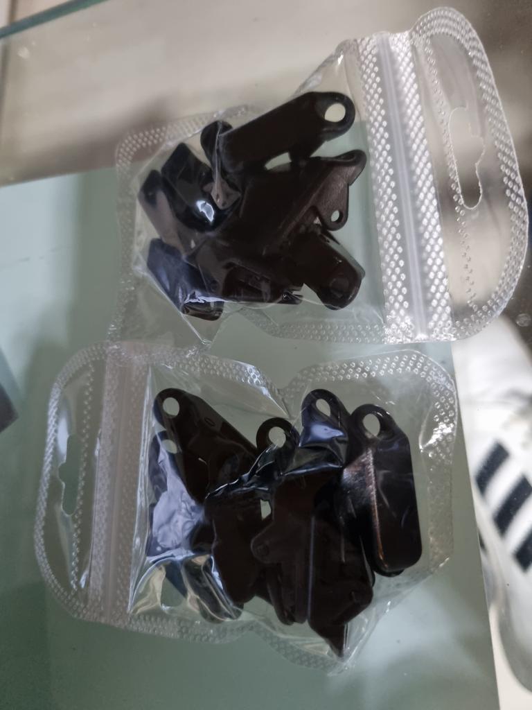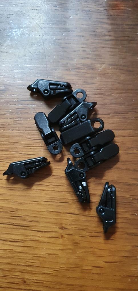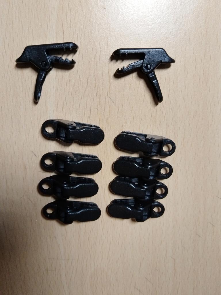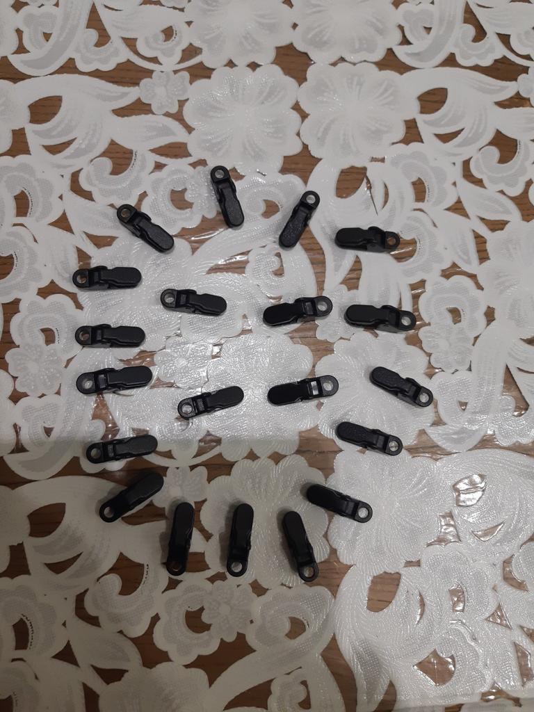 Clipes para esticar toldos, tecidos, polietileno. Para evitar fazer buracos. Há um furo no clipe para o cabo.