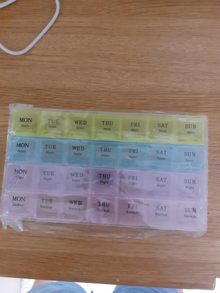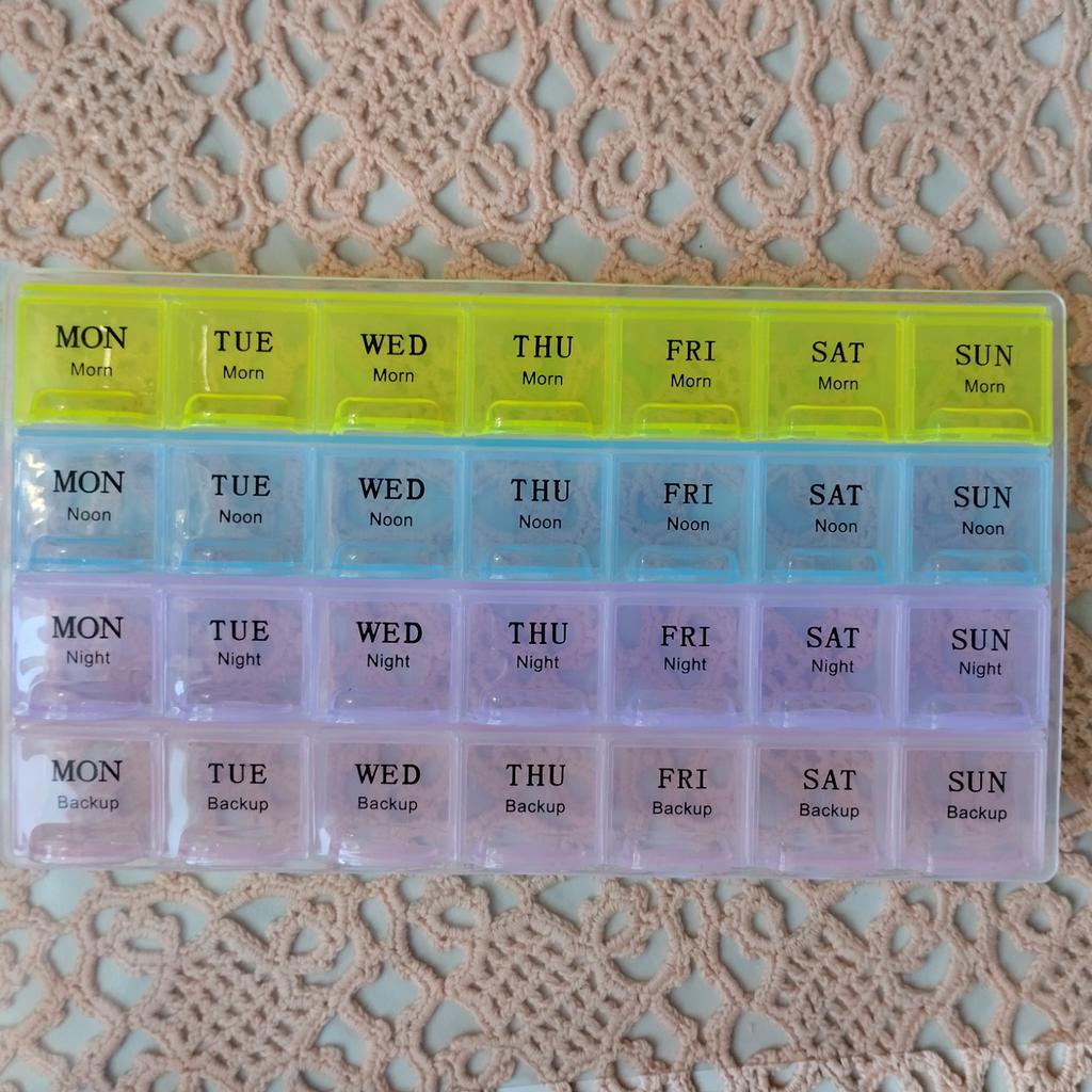 Bom organizador de comprimidos para a semana. Adequado para 4 doses diárias. Não se encontra com frequência. Conveniente!
