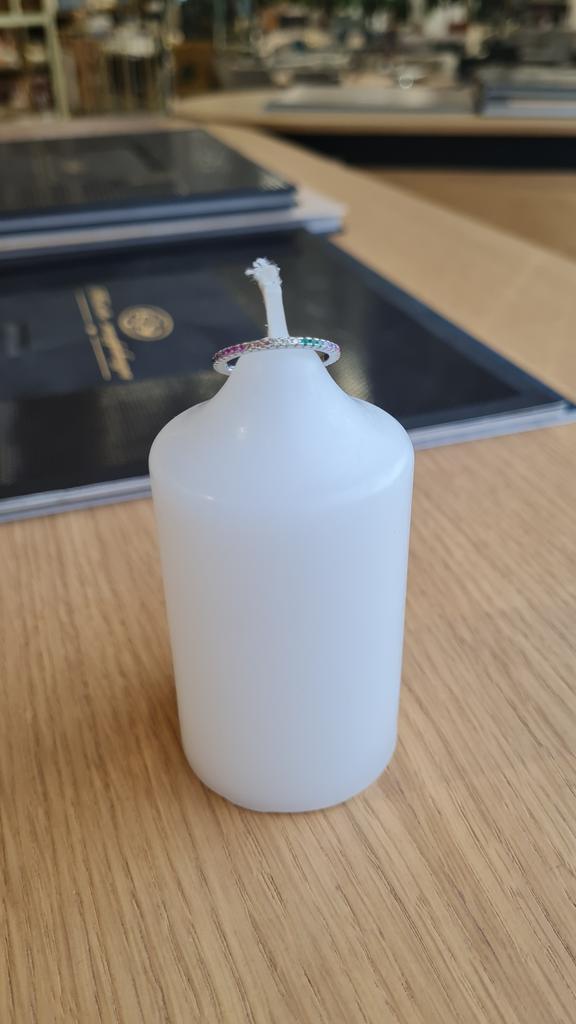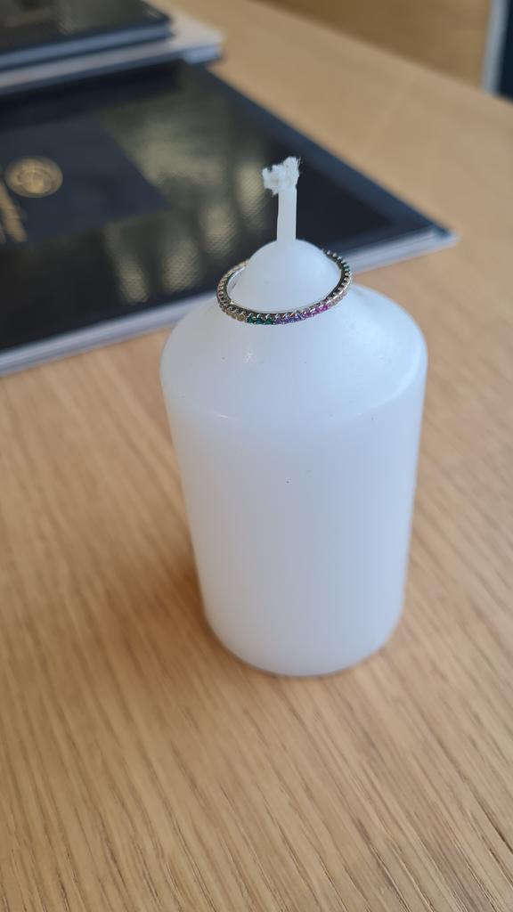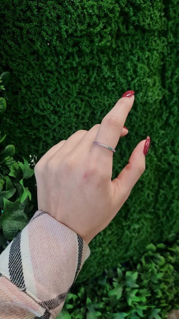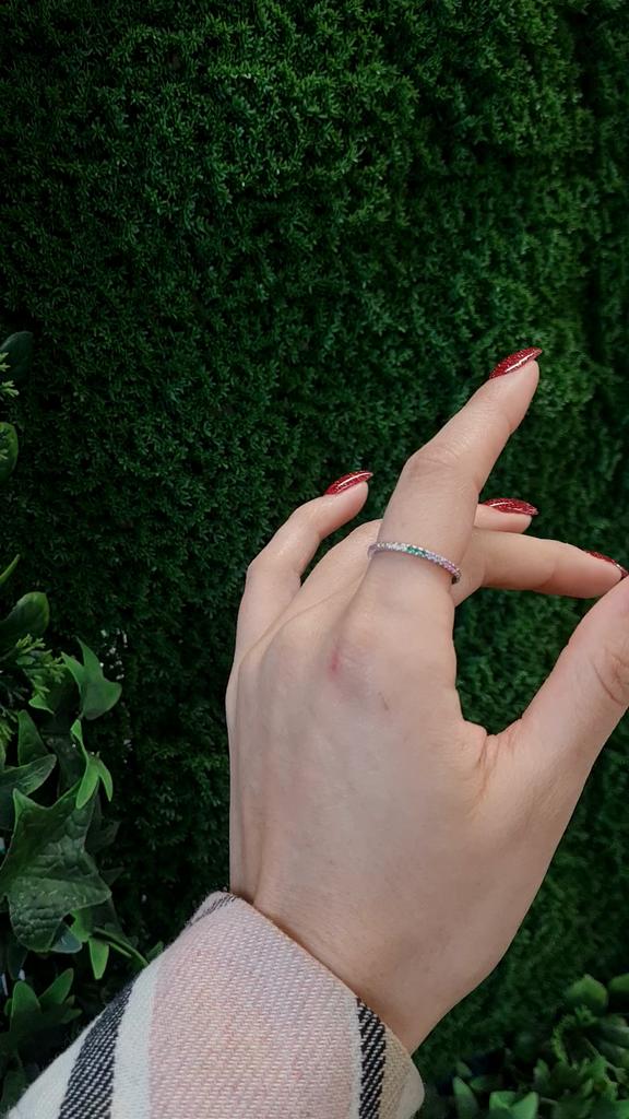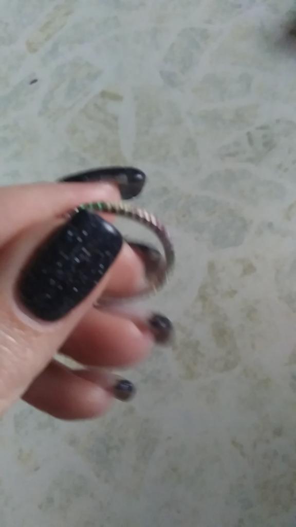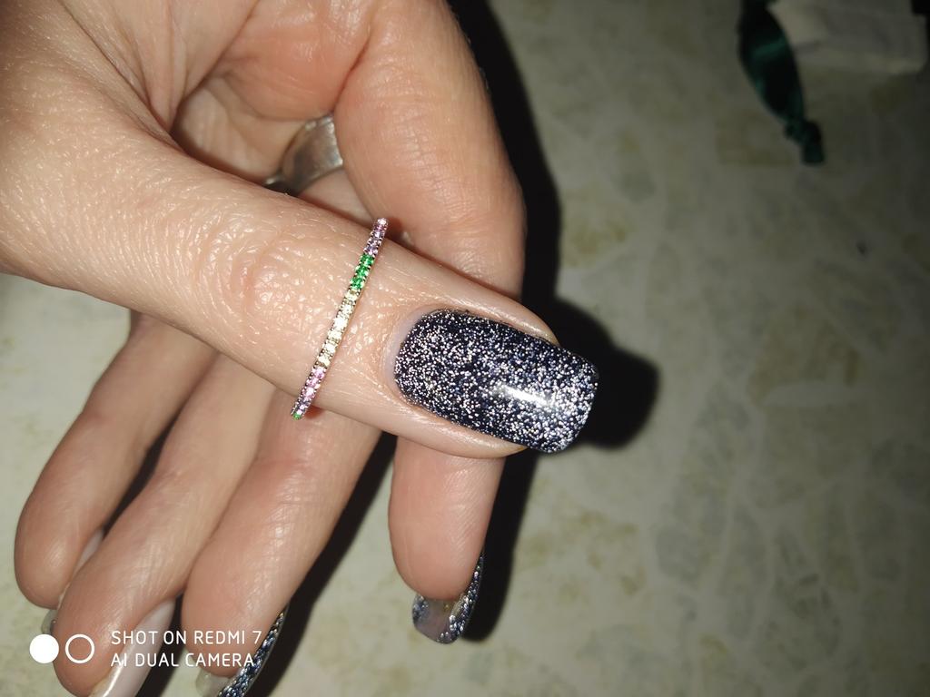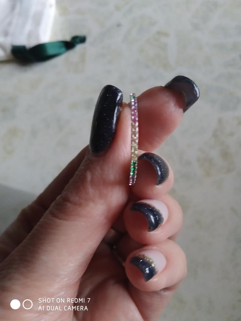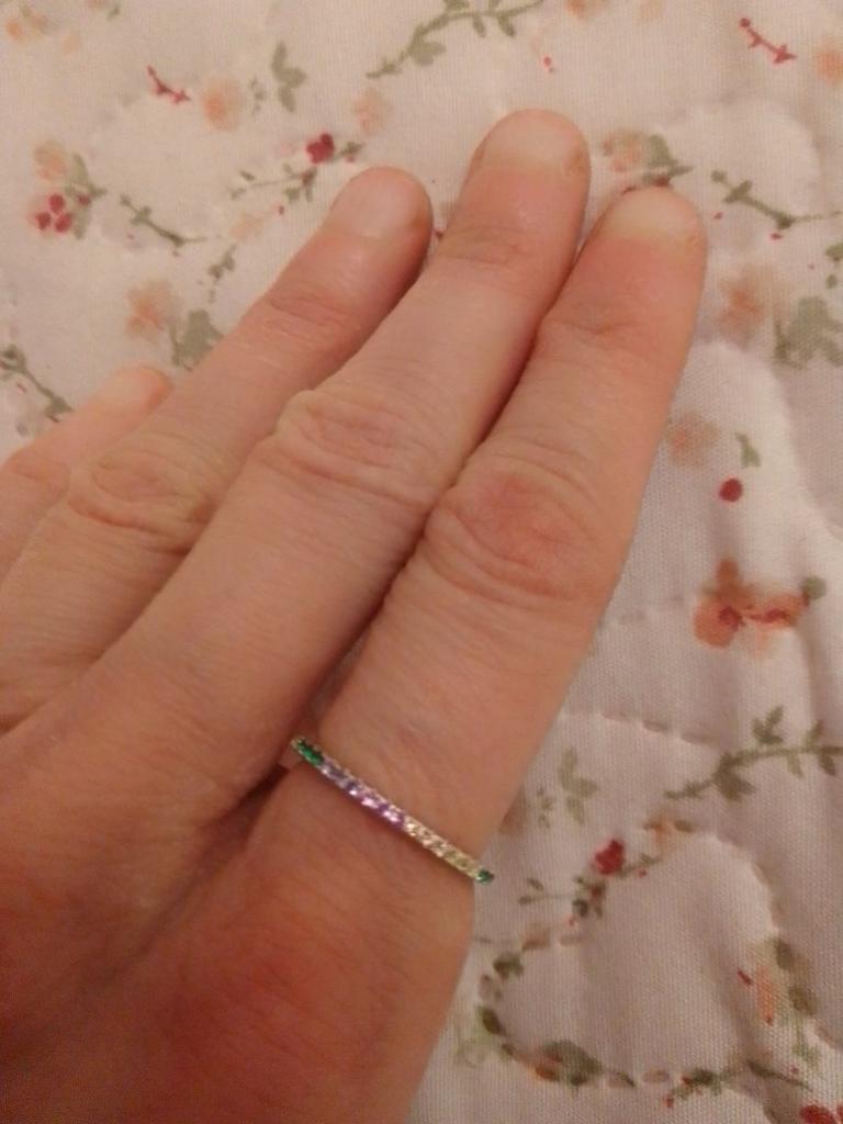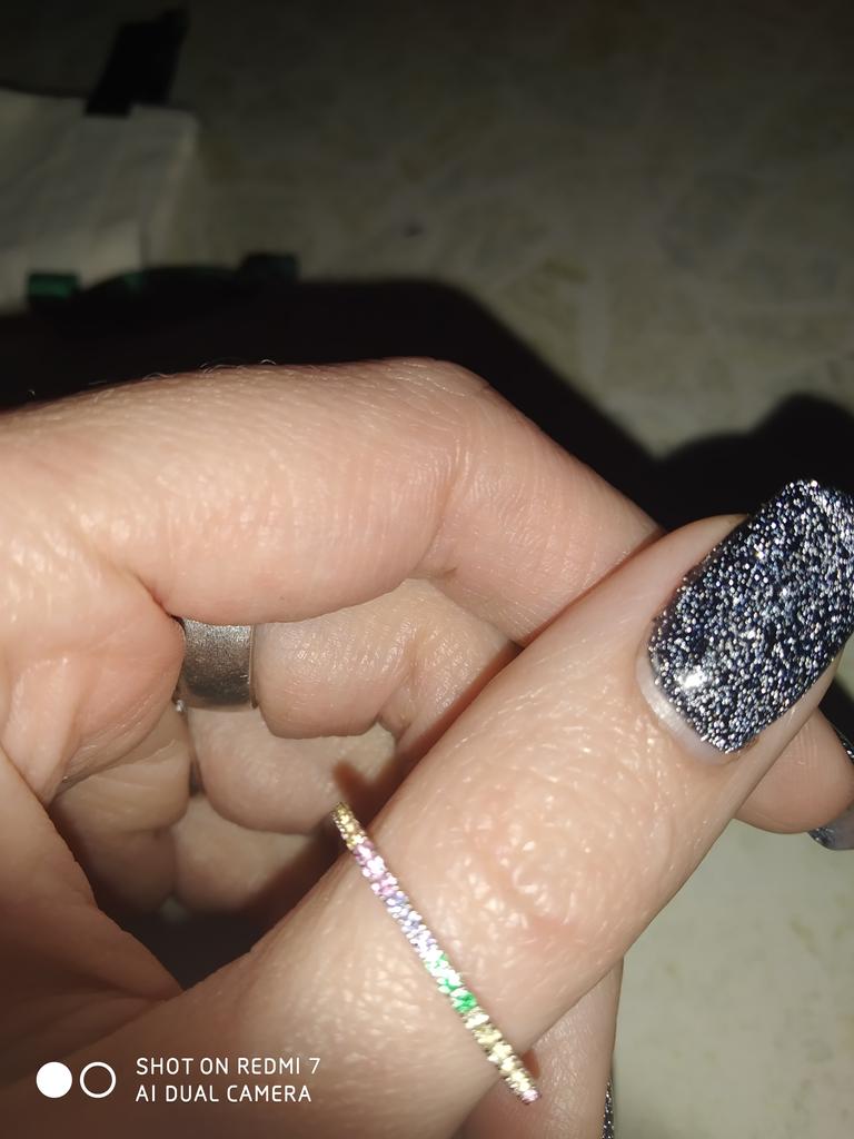 O anel é muito delicado e elegante. É a segunda vez que o tenho, já que o primeiro me foi dado por um amigo e carreguei-o durante dois anos antes de perdê-lo na mudança :) Você pode facilmente lavar as mãos e nada escurecerá ou descascará.. Encomendei-me em três cores ao mesmo tempo: transparente, rosa e arco-íris, ou seja, várias cores de pedrinhas em uma só faixa.. Recomendo comprar👍