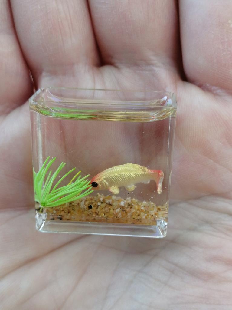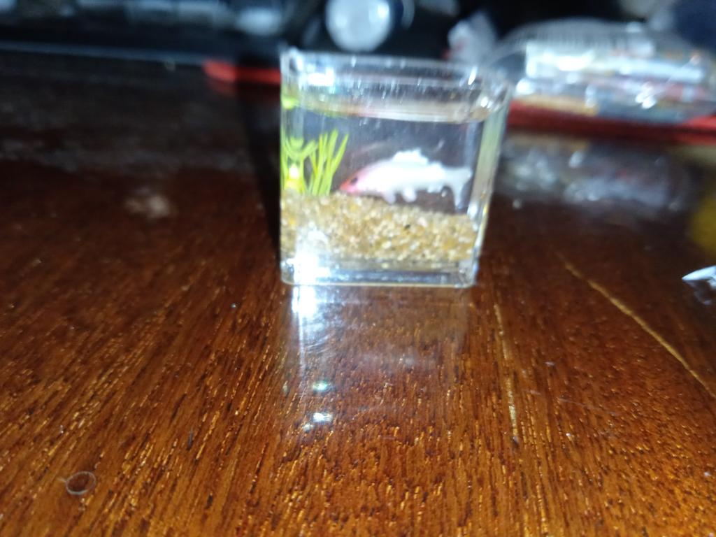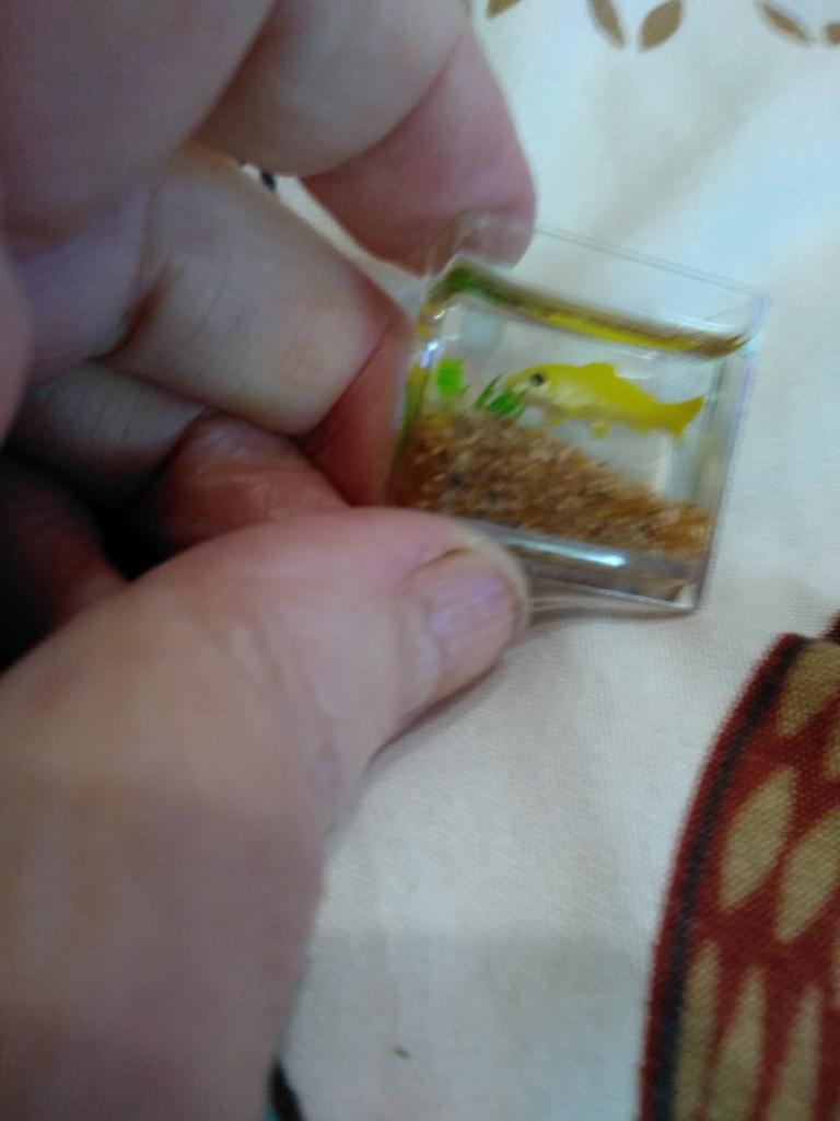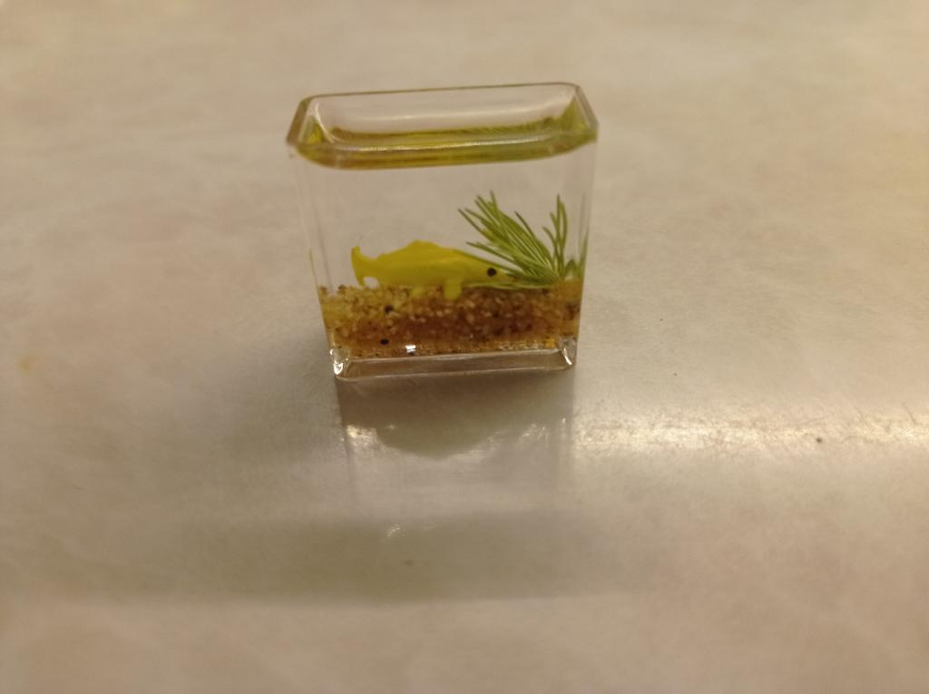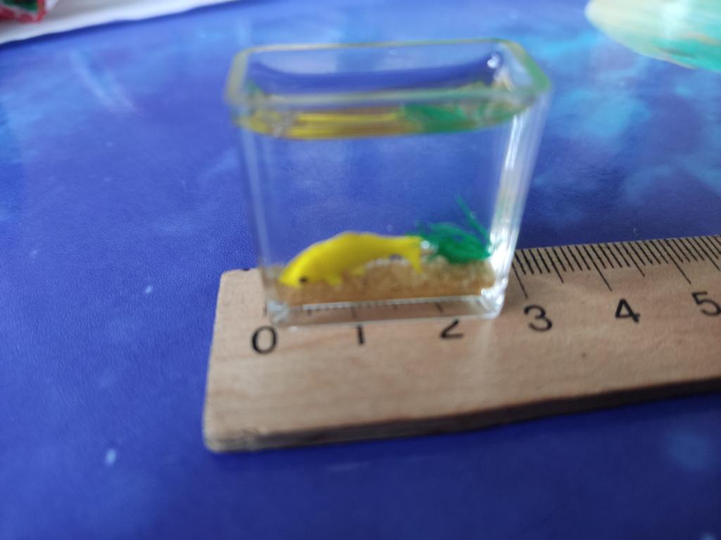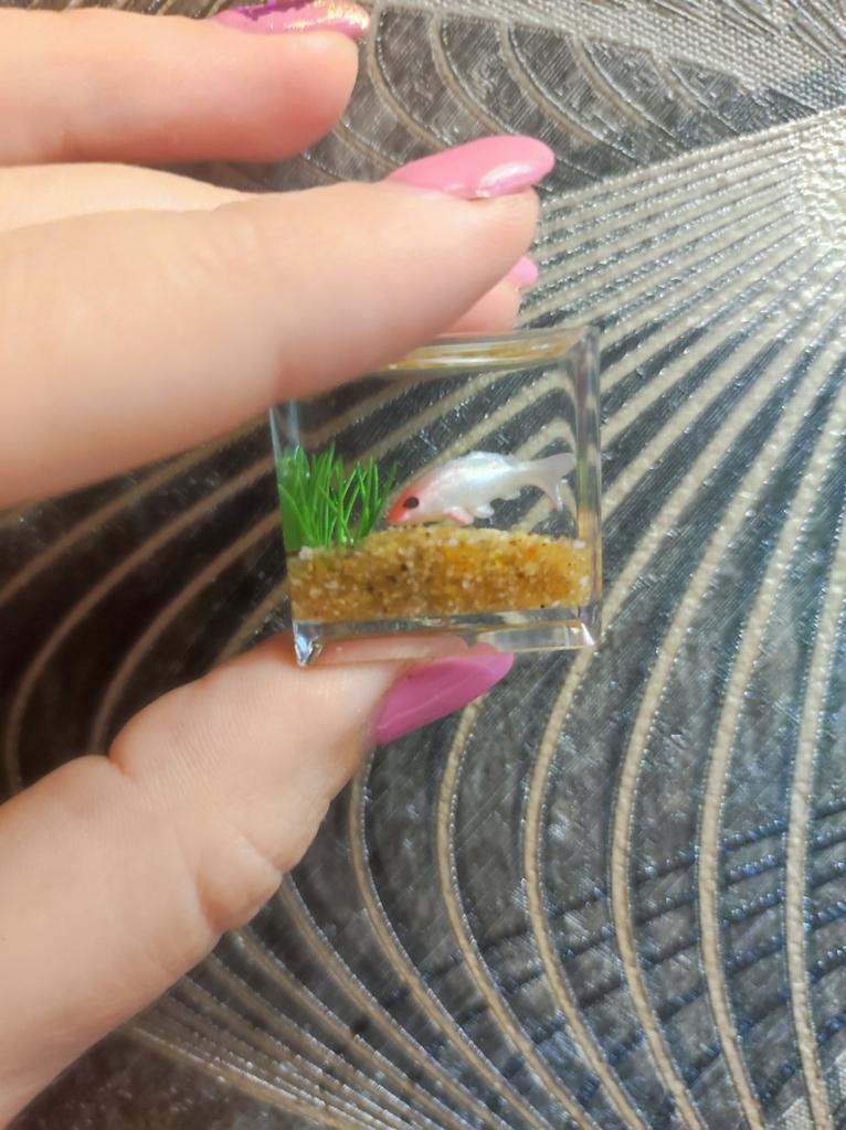 Li que o aquário é pequeno, mas é só uma miniatura (2 cm), só dá para ver no microscópio. A minicópia do aquário parece bem feita, os peixes estão bem visíveis, mas........ No futuro, você precisará ler a descrição do produto com mais atenção.
