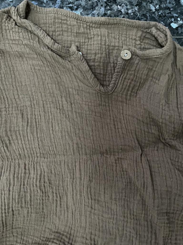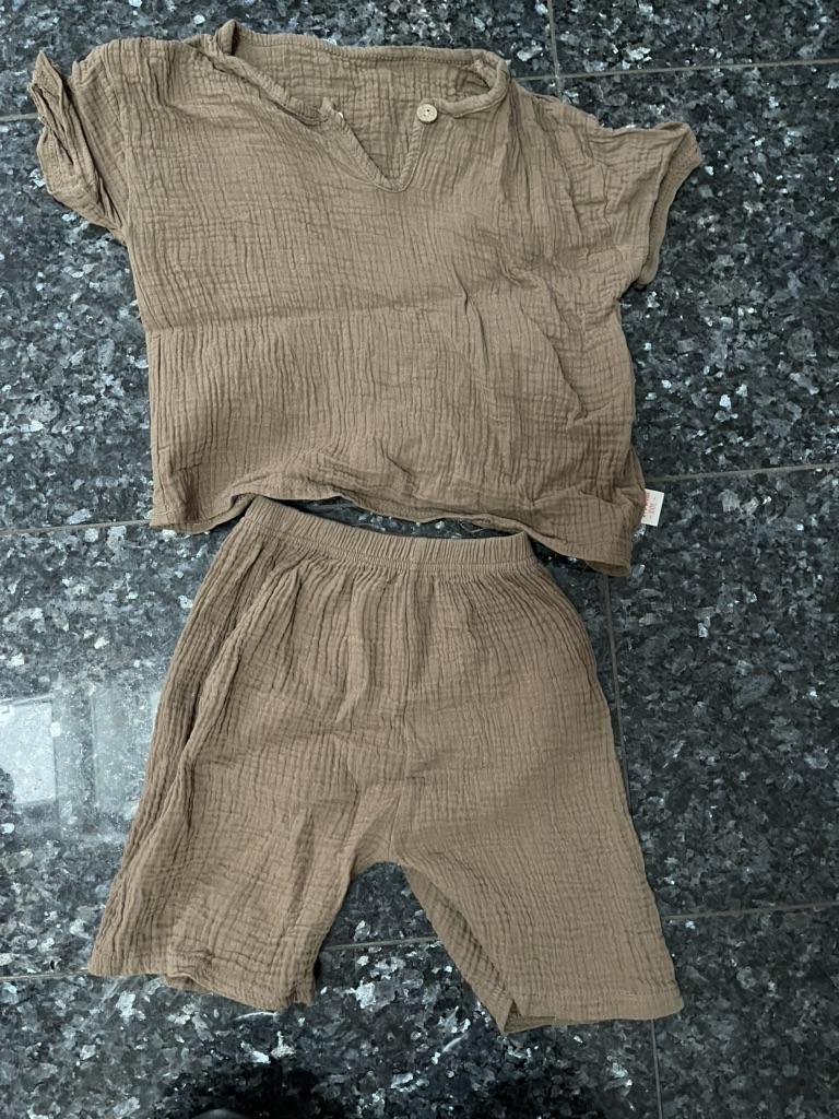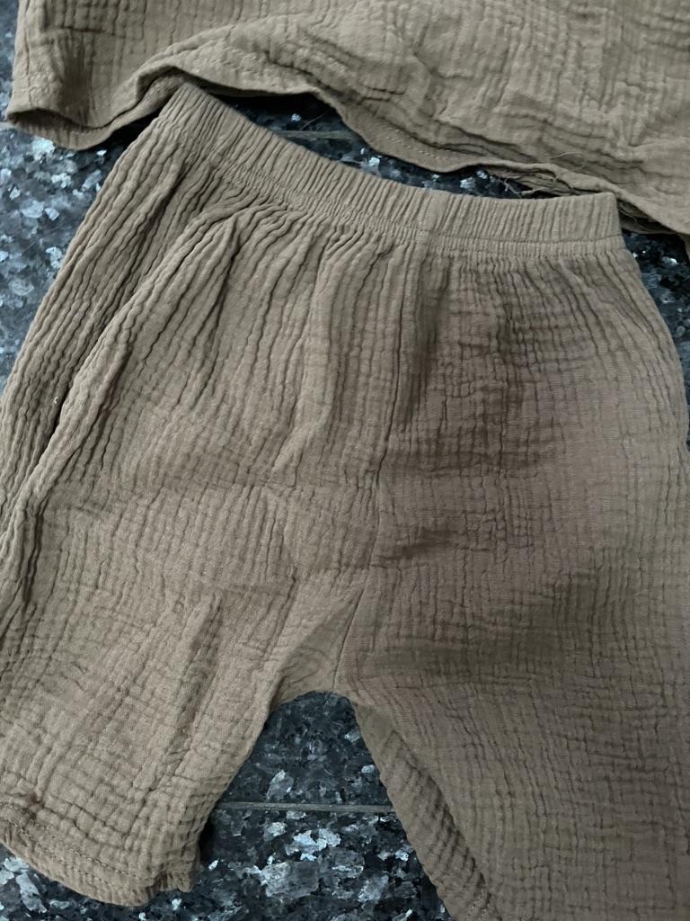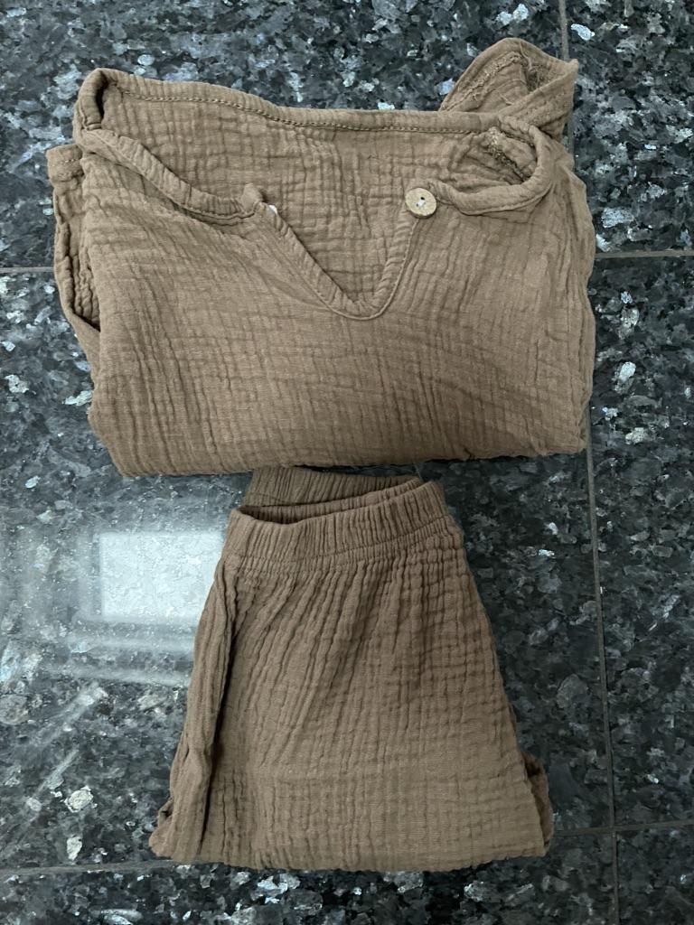 O conjunto é incrível. 💪 musselina, material macio. Perfeito para o verão ☀️ A cor é difícil de definir, pelo menos para mim 🙈 cáqui, mas mais castanho,... bege escuro 🤷 Infelizmente, a foto não reflete a cor real Tamanho perfeito para o meu filho alto de 4 anos (110cm, 18kg). Elástico na cintura, sem esticar - 18cmx2, estica até 34cmx2 O único inconveniente é a etiqueta cosida do lado de fora 🙈 Agora tenho que tentar recortar bem 😋