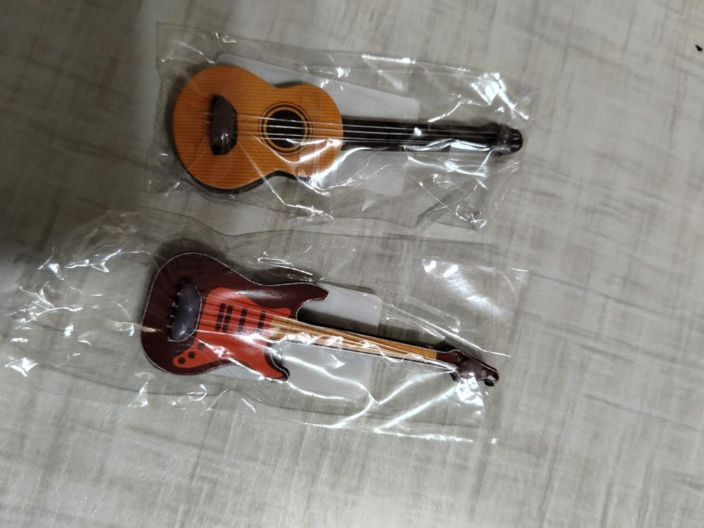 Chegaram duas guitarras. Pequeno e fofo. É uma pena que o tamanho não esteja indicado em números no cartão.