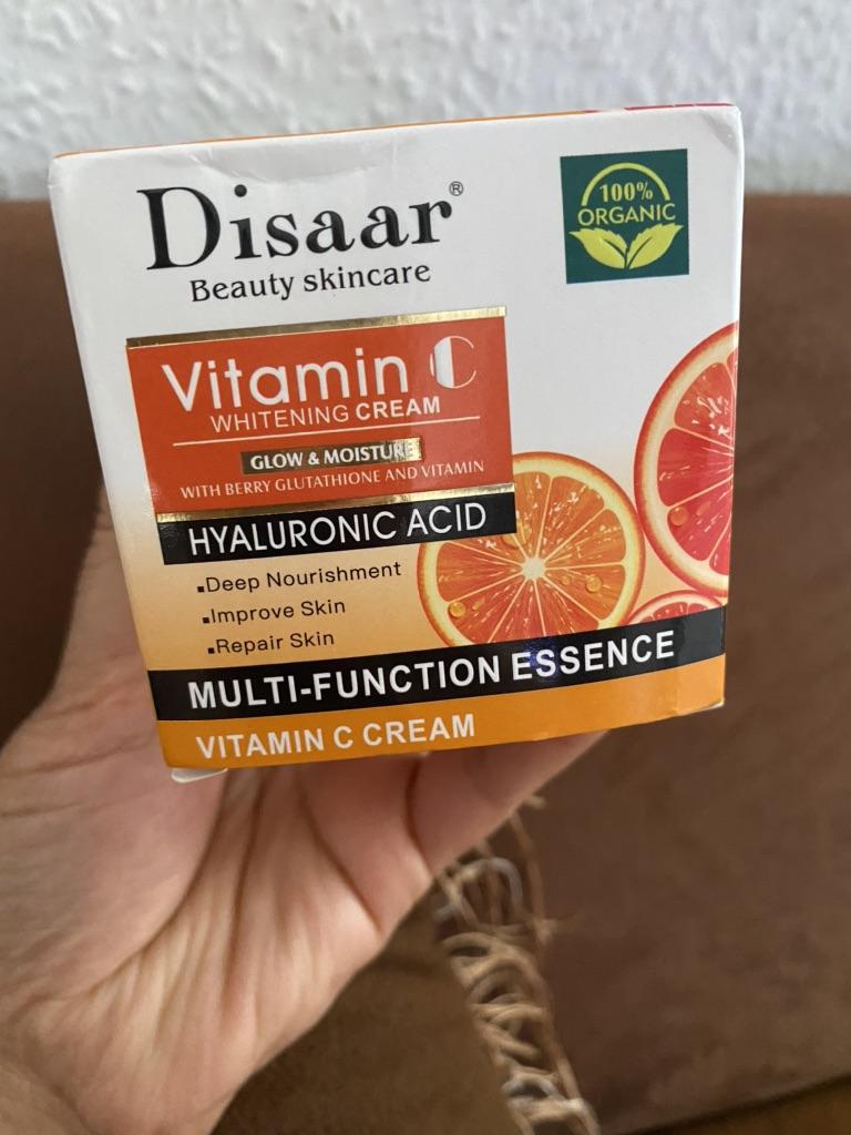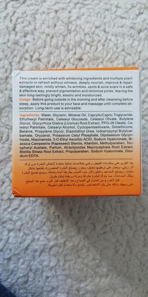 O creme chegou bem embalado e seguro. A mercadoria chegou antes da data especificada. O creme em si é muito macio e cheiroso. Ele funciona muito bem na pele. Torna a pele macia e confortável. Ele pode realmente clarear a pele através de uma variedade de usos. Depois de algumas espinhas, desenvolvi manchas escuras. Usei o creme no local dia após dia e também ficou mais claro de modo que quase não dava para ver. Uma pequena quantidade é suficiente para a aplicação. Os primeiros efeitos podem ser vistos após uma semana. No geral um produto muito bom. 🤌
